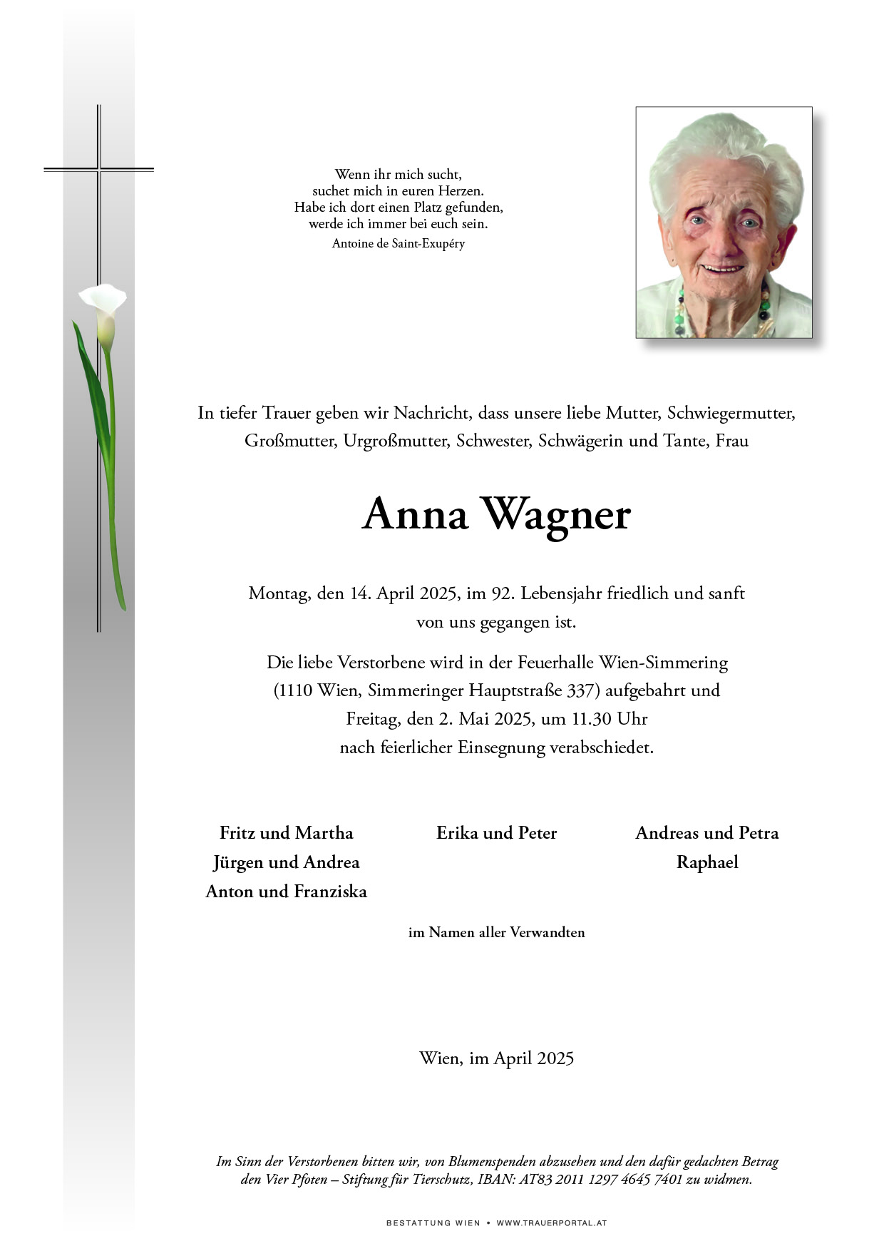 Bestattung wurde durchgeführt von: Bestattung Wien Bestattung Wien GmbH Simmeringer Hauptstraße 339 1110 - Wien (Simmering) Tel.: 01 501950 zum Bestatter
