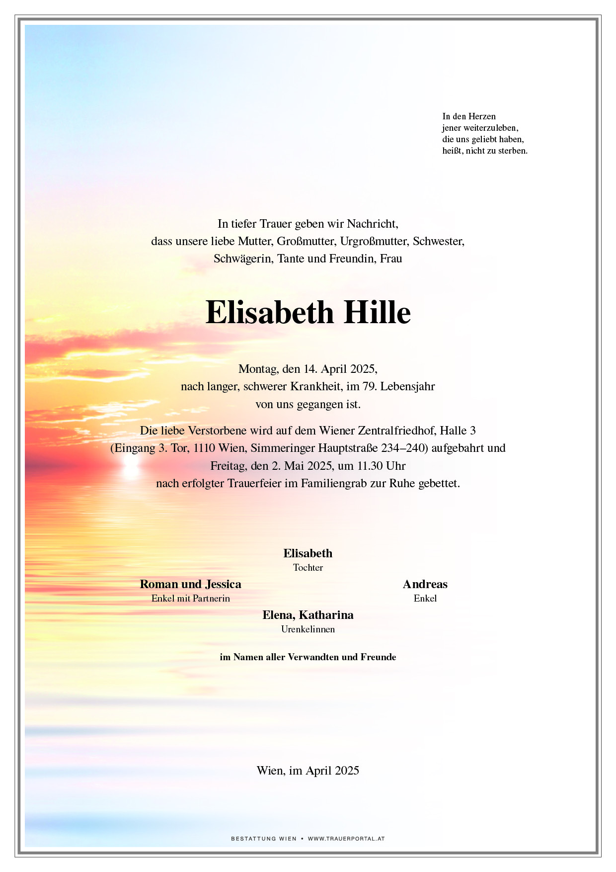 Bestattung wurde durchgeführt von: Bestattung Wien Bestattung Wien GmbH Simmeringer Hauptstraße 339 1110 - Wien (Simmering) Tel.: 01 501950 zum Bestatter