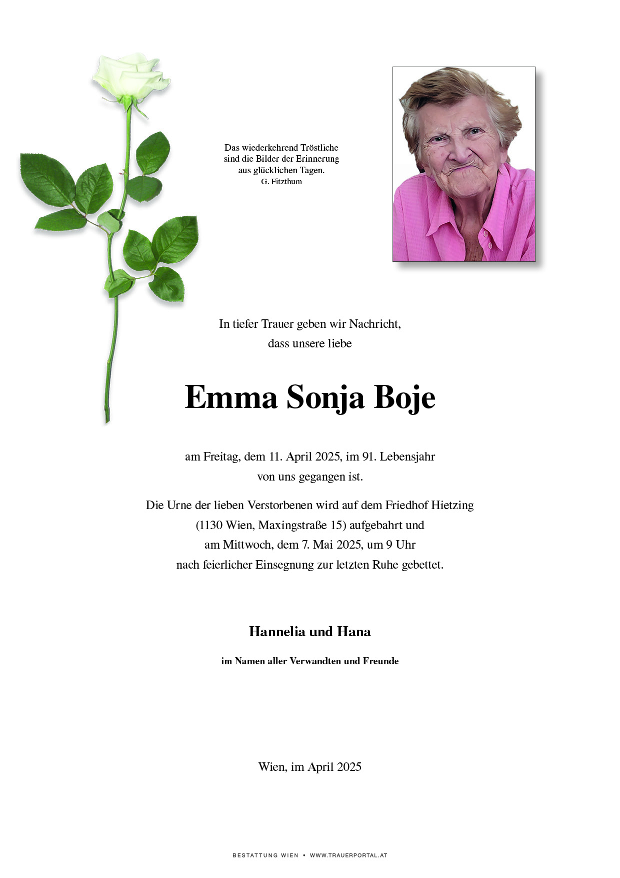 Bestattung wurde durchgeführt von: Bestattung Wien Bestattung Wien GmbH Simmeringer Hauptstraße 339 1110 - Wien (Simmering) Tel.: 01 501950 zum Bestatter