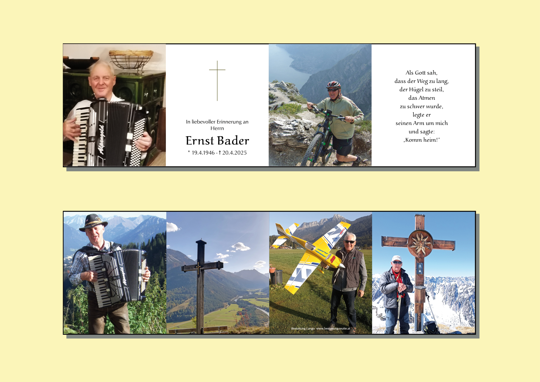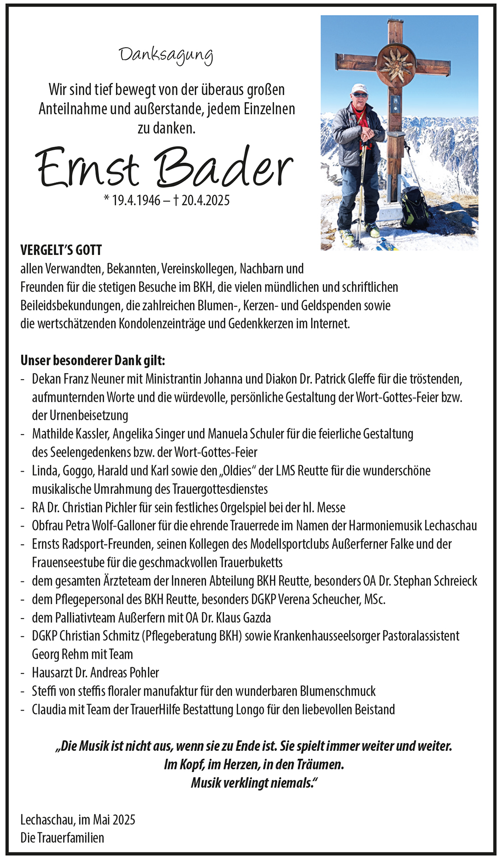 Mit dem Verlust eines geliebten Menschen verliert man viel, aber niemals die wunderschönen Erinnerungen an die gemeinsam verbrachte Zeit! Mit seiner Musik hat er viele tausend Menschen ihre Sorgen vergessen lassen und hat sie für unzählige Stunden fröhlich und glücklich gemacht! Auch beim Musikantentreffen im Café Fredy in Wängle ist er immer wieder für einen „guten Zweck“ aufgetreten!