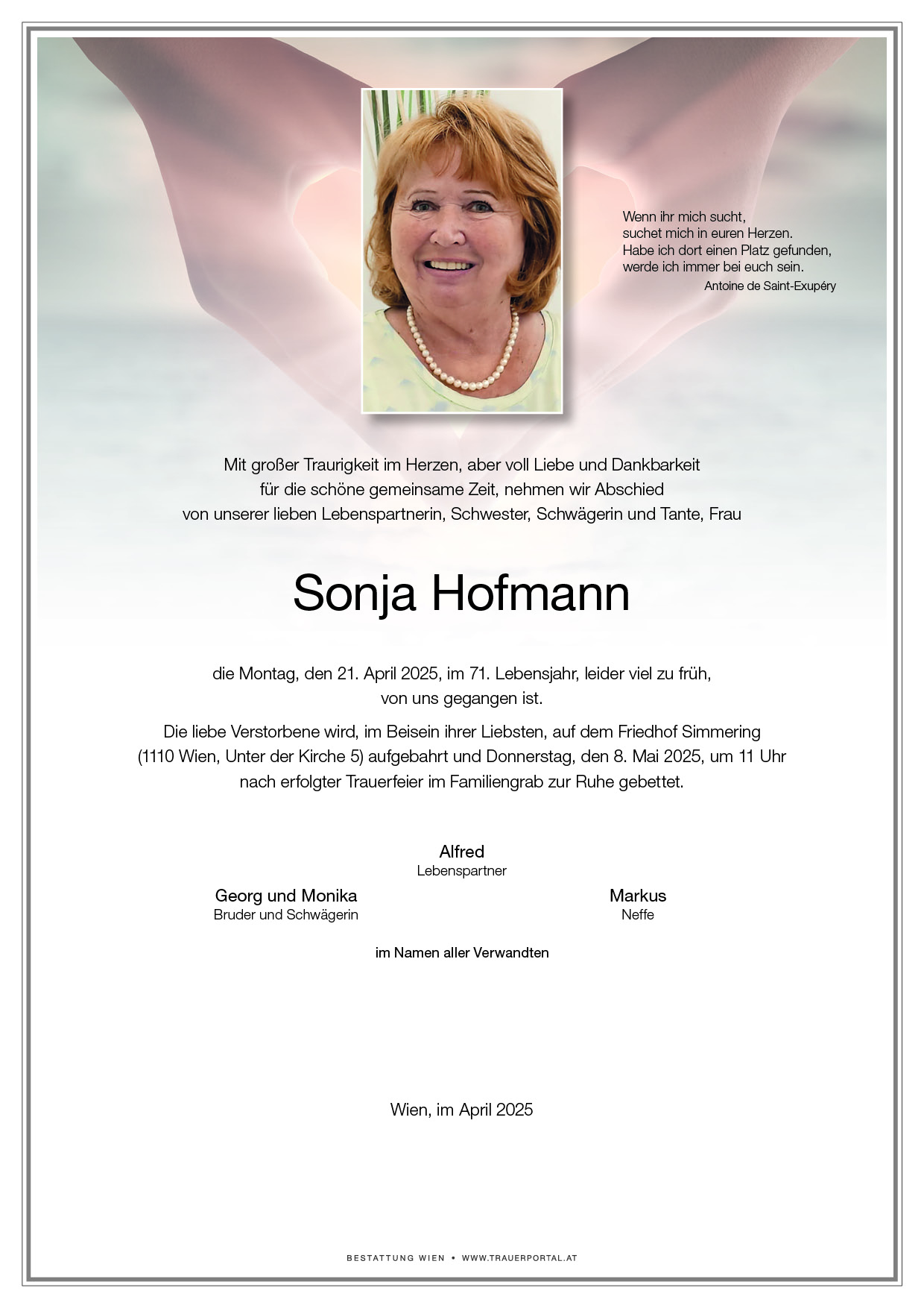 • Leider ist Sonja viel zu früh von uns gegangen. Ich werde sie immer in Erinnerung behalten.