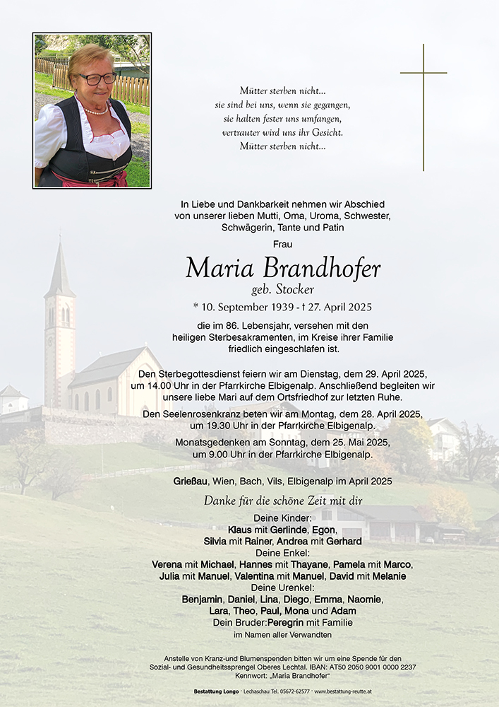 „Begrenzt auf Erden ist unsere Zeit. Doch die Liebe zur Mutter bleibt für die Ewigkeit.“28.04.2025 19:57 - Ingrid Beirer