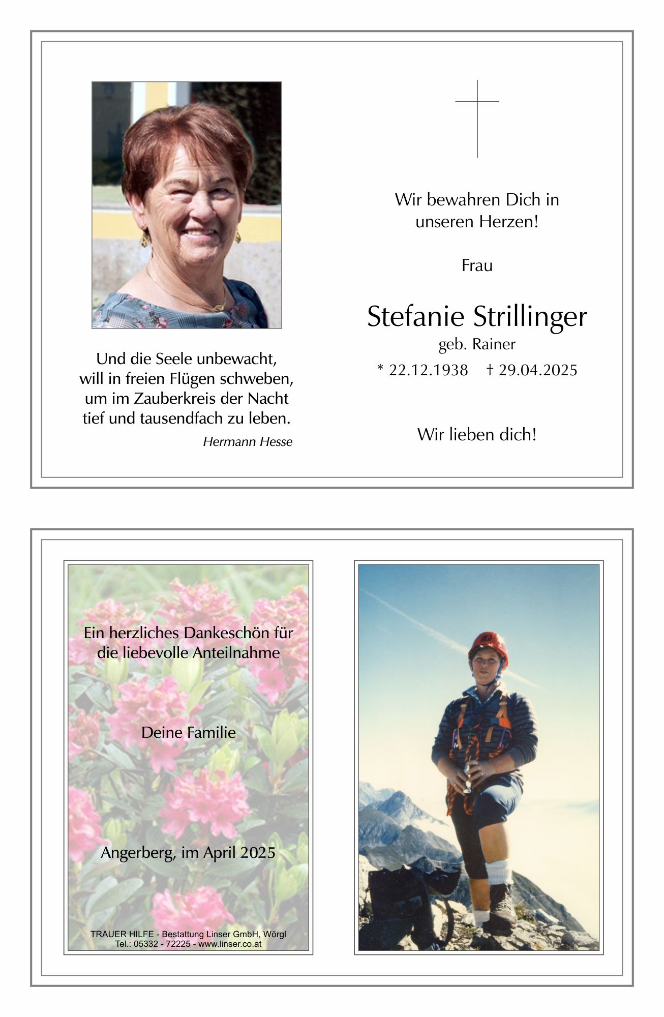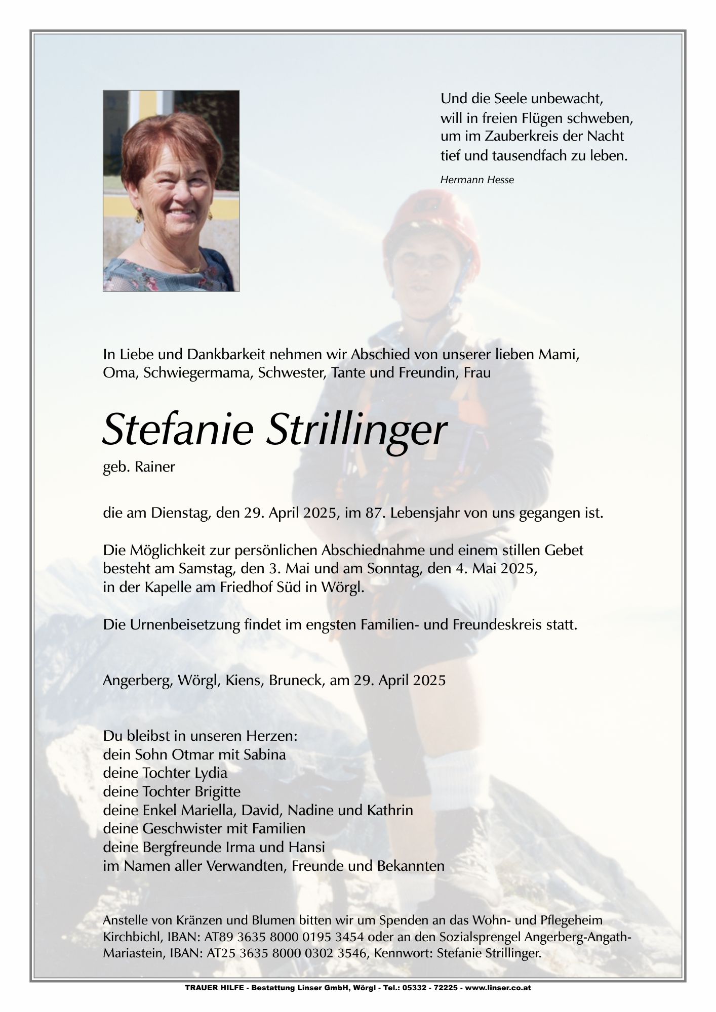 Bestattung wurde durchgeführt von: Walter Linser TrauerHilfe Bestattung Linser GmbH Wildschönauerstraße 41 6300 - Wörgl Tel.: 05332 72225 zum Bestatter