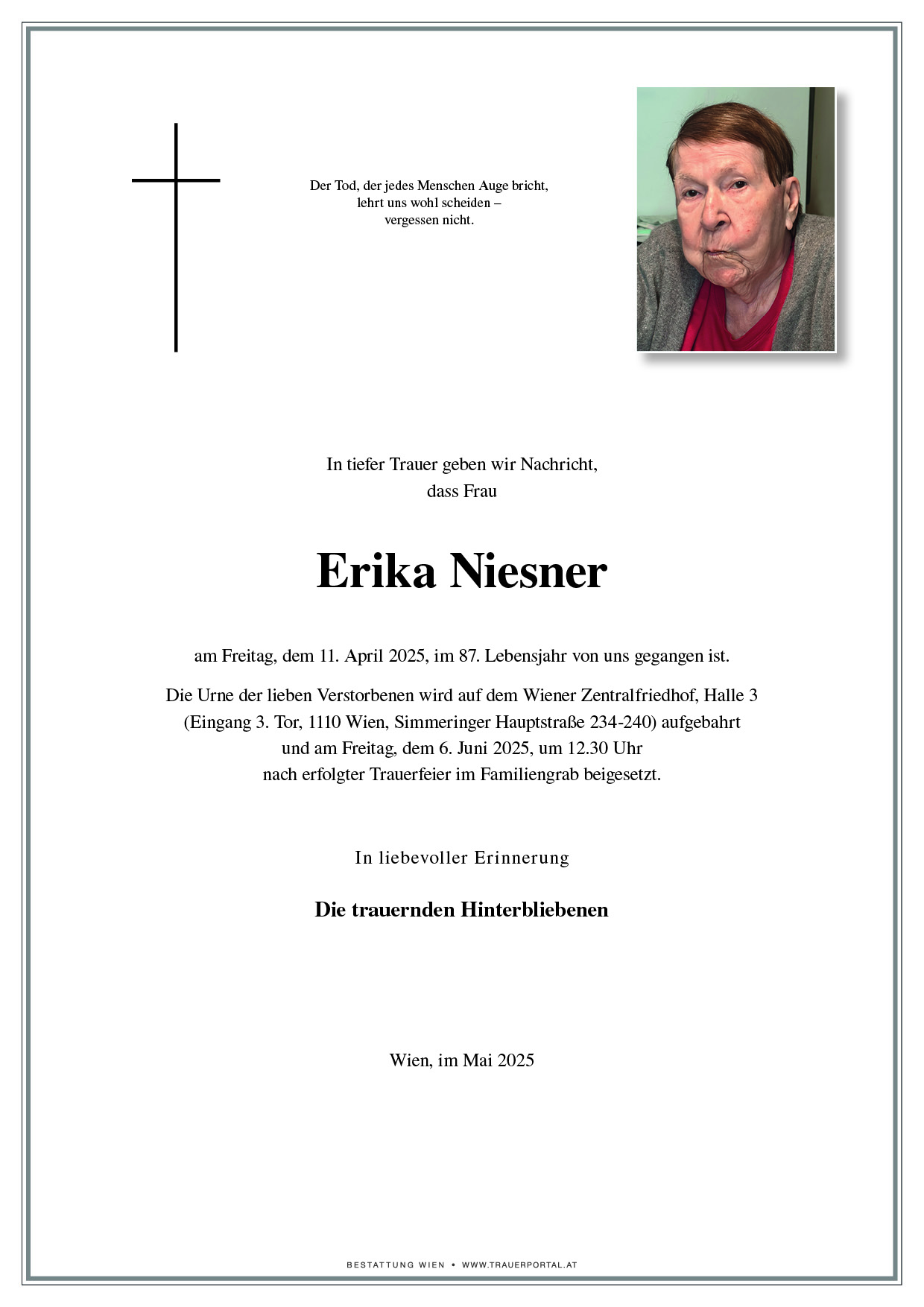Bestattung wurde durchgeführt von: Bestattung Wien Bestattung Wien GmbH Simmeringer Hauptstraße 339 1110 - Wien (Simmering) Tel.: 01 501950 zum Bestatter