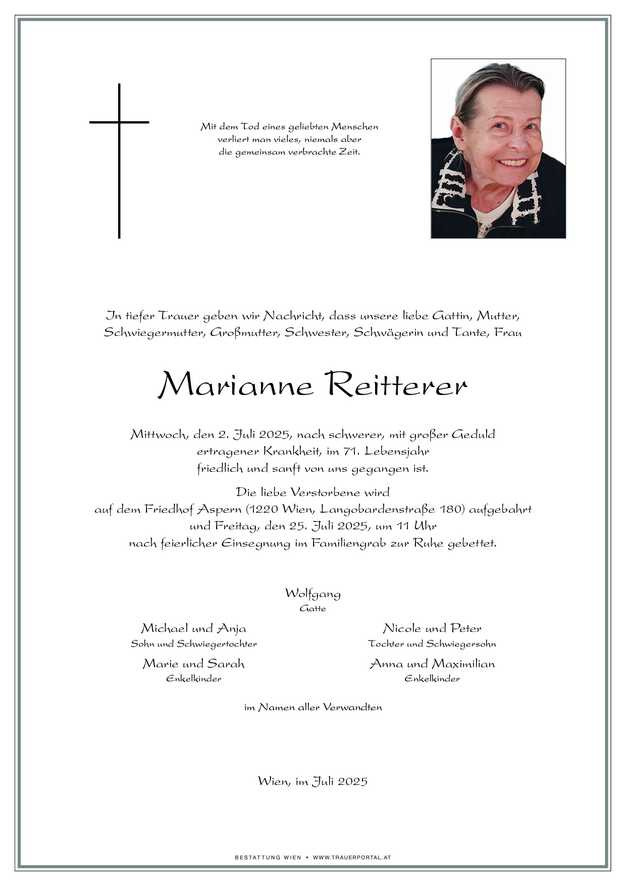 Bestattung wurde durchgeführt von: Bestattung Wien Bestattung Wien GmbH Simmeringer Hauptstraße 339 1110 - Wien (Simmering) Tel.: 01 501950 zum Bestatter