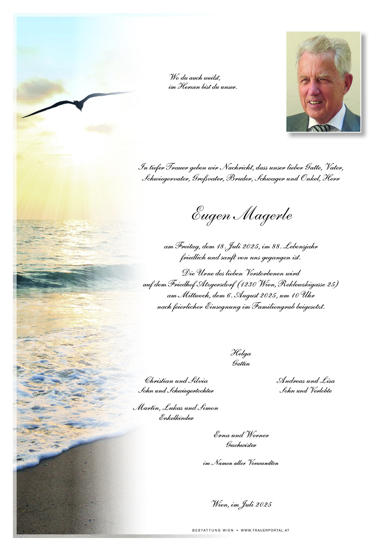 Bestattung wurde durchgeführt von: Bestattung Wien Bestattung Wien GmbH Simmeringer Hauptstraße 339 1110 - Wien (Simmering) Tel.: 01 501950 zum Bestatter