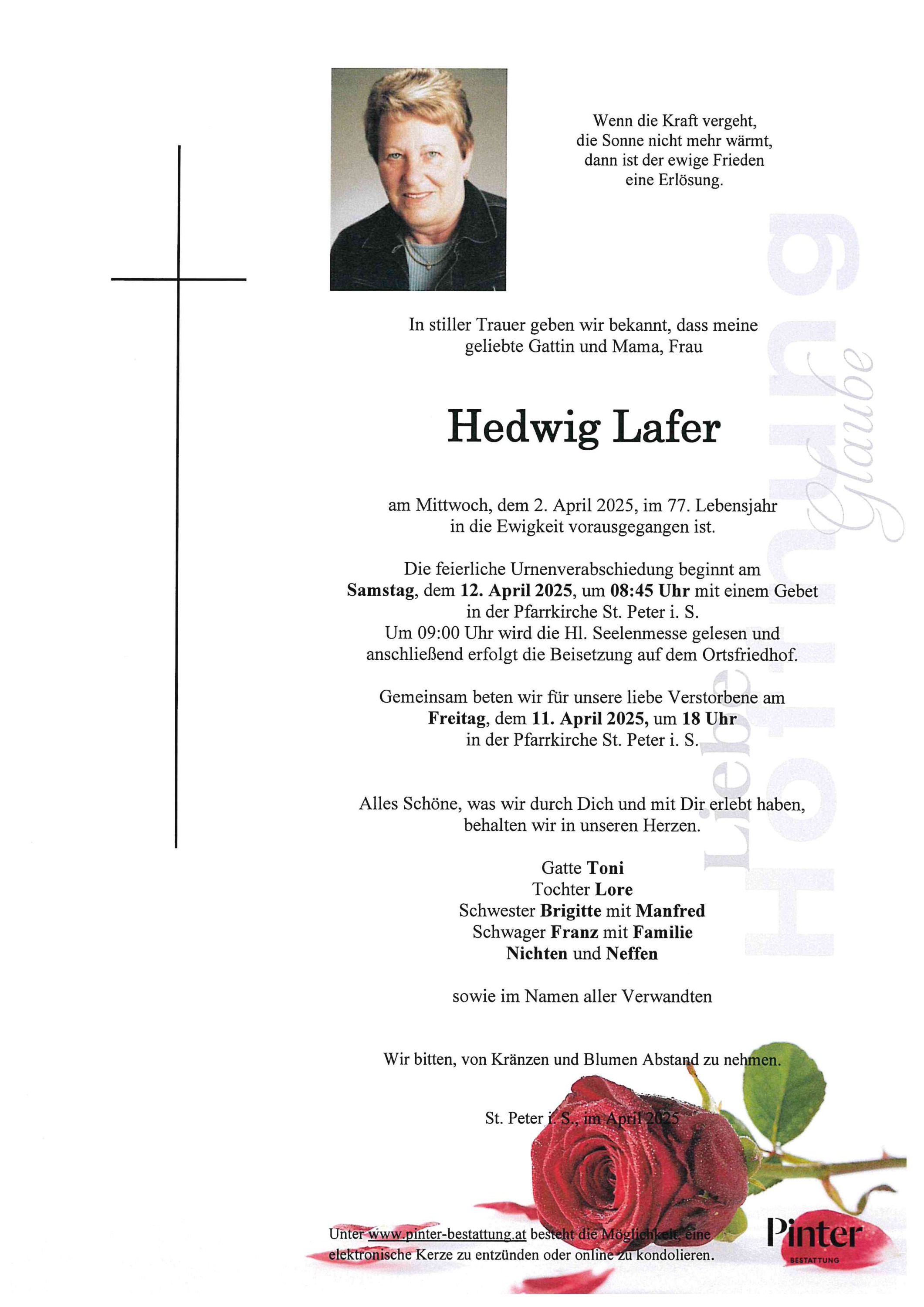 Bestattung wurde durchgeführt von: Pinter GmbH Pinter GmbH Nelkengasse 1-3 8530 - Deutschlandsberg Tel.: +43 3462 2907 zum Bestatter