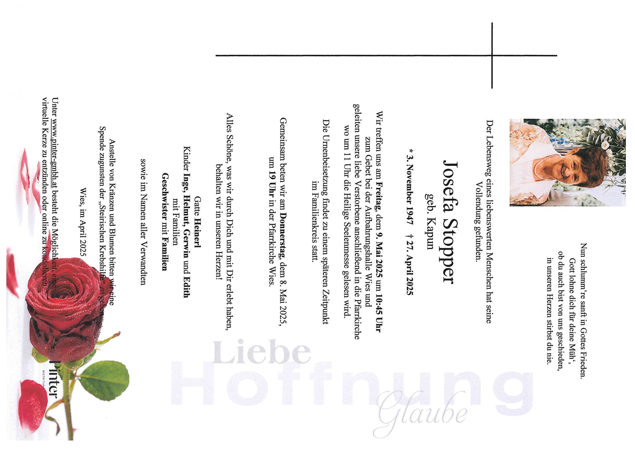 Bestattung wurde durchgeführt von: Pinter GmbH Pinter GmbH Nelkengasse 1-3 8530 - Deutschlandsberg Tel.: +43 3462 2907 zum Bestatter