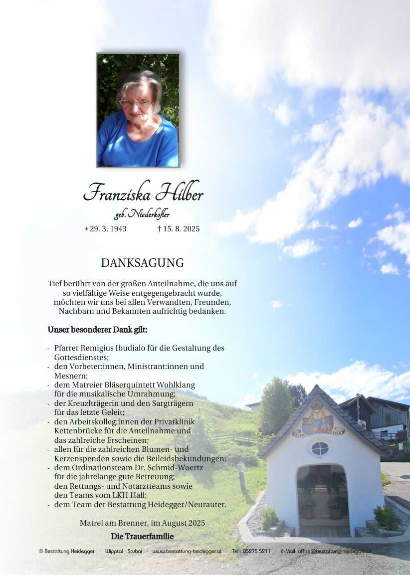 Bestattung wurde durchgeführt von: Karl Neurauter Karl Neurauter Bestattung Heidegger Brennerstraße 69 6150 - Steinach am Brenner Tel.: 05275 5211 zum Bestatter
