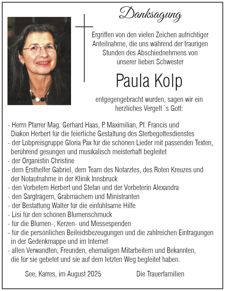 Liebe Trauerfamilie, Paulas so plötzlicher Tod stimmt uns traurig. Erst am Sonntagnachmittag habe ich noch längeres Telefonat mit ihr geführt und wir haben uns über Gott und die Welt unterhalten. Ich habe sie noch gebeten für meine baldige Fahrschulprüfung zu beten. Es ist schwer zu begreifen, dass sie das nun vom Himmel aus tut. Ihre Nächstenliebe und Warmherzigkeit werden uns immer an Paula denken lassen. Sie hat in ihrem Leben viele Samen von Liebe und Freude gesäät. Ich bin mir sicher, dass ihr Gott nun alles vergelten wird und die "Ernte" groß sein wird. Unser herzliches Beileid zu eurem Verlust entbieten euch