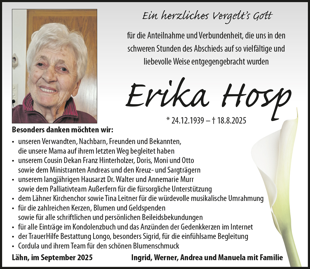Zum Verlust von Eurer lieben Erika möchten wir Euch unser aufrichtiges Beileid und tiefes Mitgefühl ausdrücken.🖤