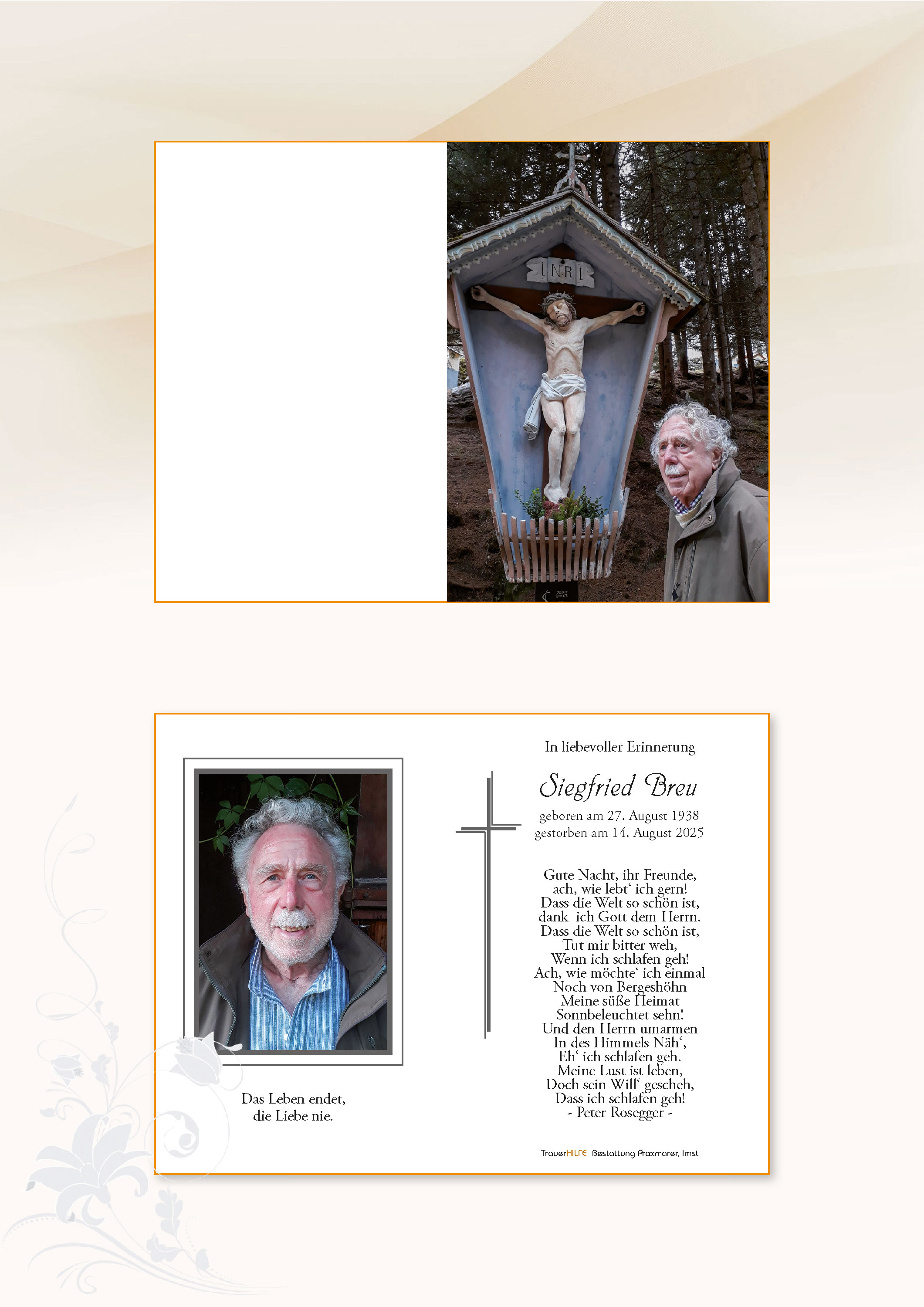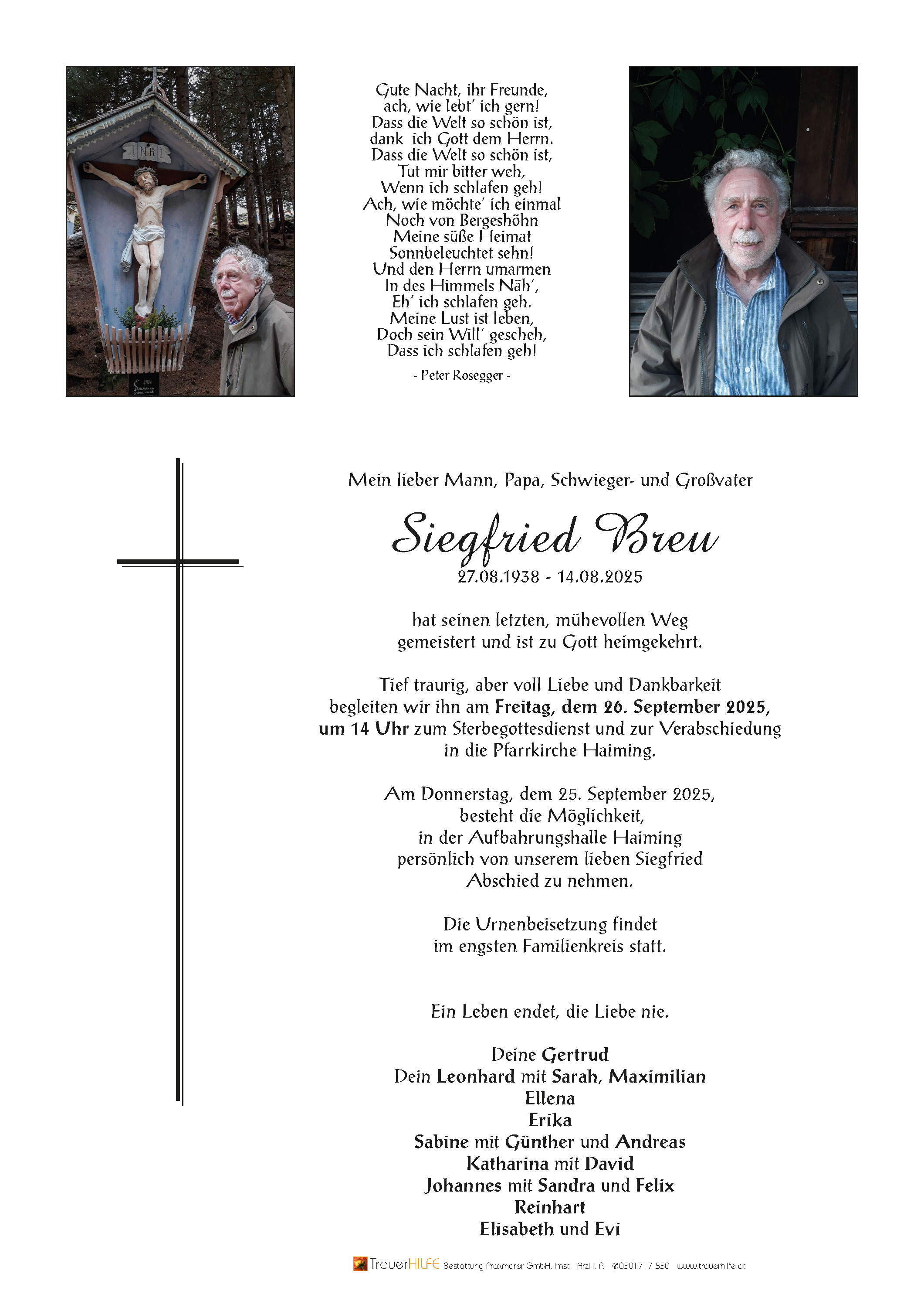 Wir durften Siegfried auf einem Teil seines Weges begleiten und erinnern uns gern an die gemeinsamen Momente zurück. Das gesamte Team der Mittleren Oberinntal Pflege möchte euch ein aufrichtiges Beileid ausdrücken.24.09.2025 08:46 - Mittlere Oberinntal Pflege GmbH