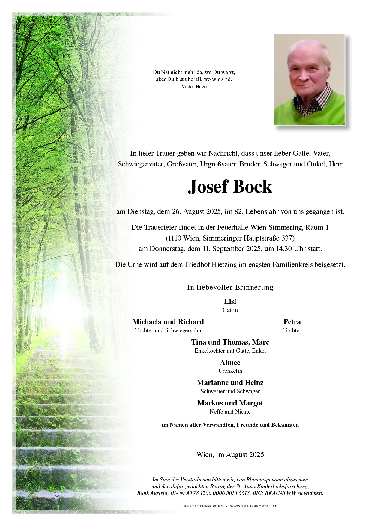 Bestattung wurde durchgeführt von: Bestattung Wien Bestattung Wien GmbH Simmeringer Hauptstraße 339 1110 - Wien (Simmering) Tel.: 01 501950 zum Bestatter