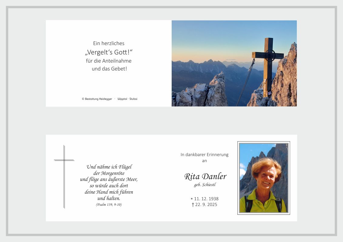 Bestattung wurde durchgeführt von: Karl Neurauter Karl Neurauter Bestattung Heidegger Brennerstraße 69 6150 - Steinach am Brenner Tel.: 05275 5211 zum Bestatter