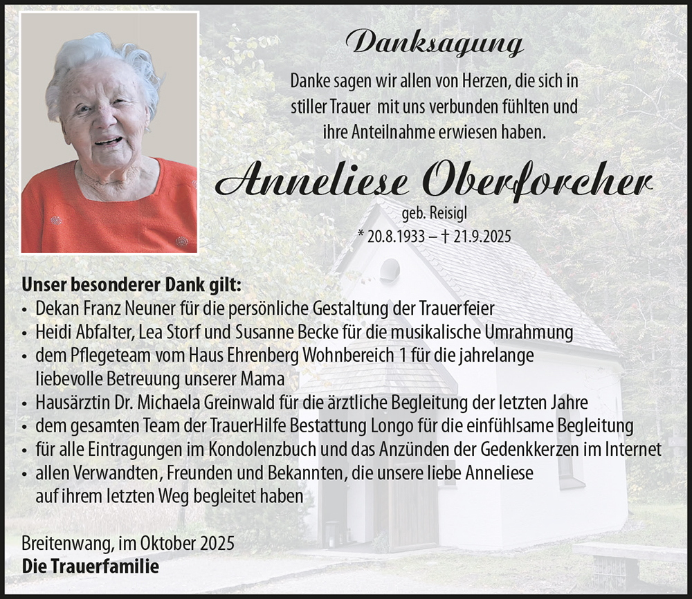 In diesem Sinne, liebe Anneliese, fliege weit, hoch hinaus in den Himmel, leicht wie ein Vogel ohne Last. Breite deine Flügel aus und beschütze von da oben deine Lieben.