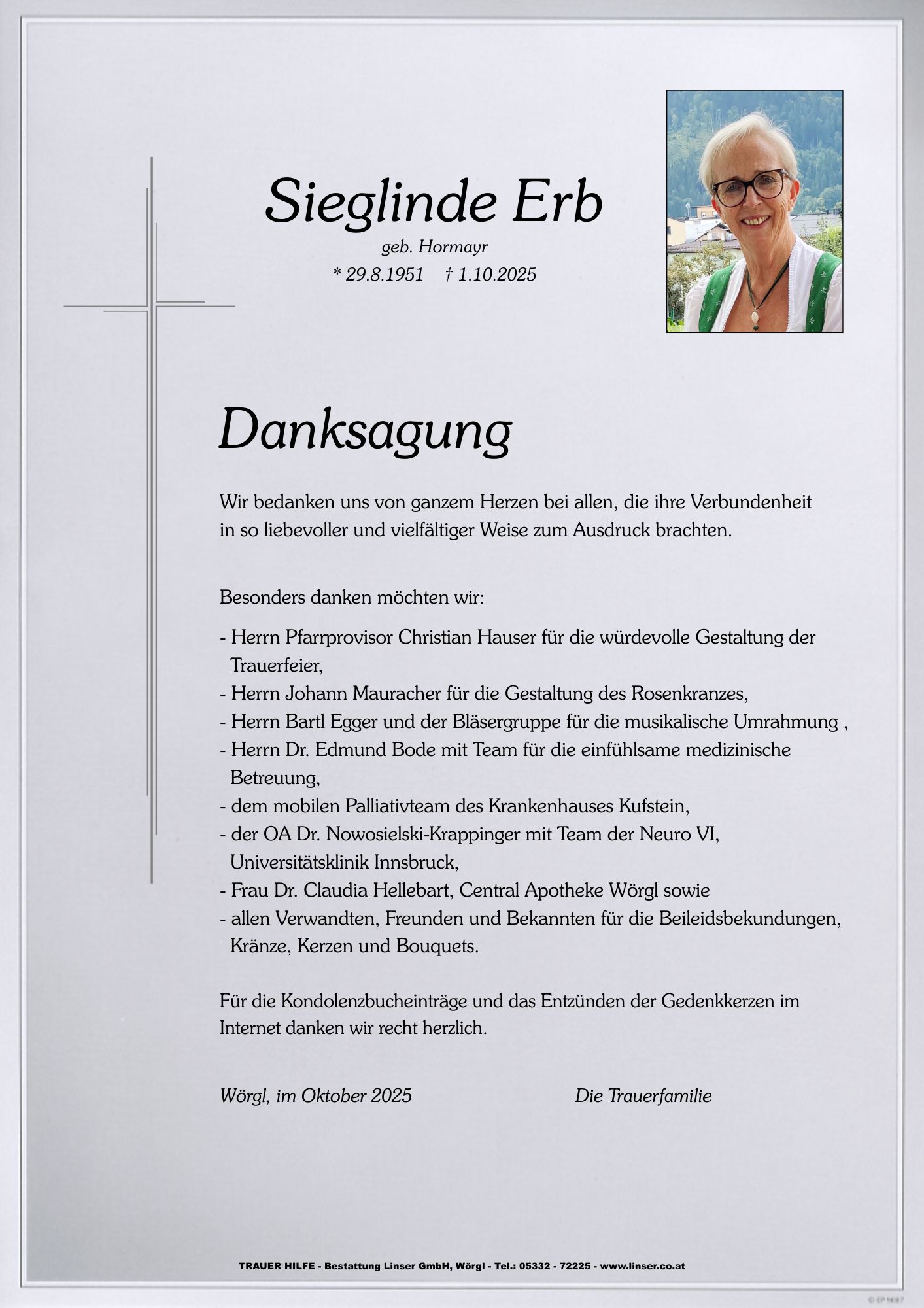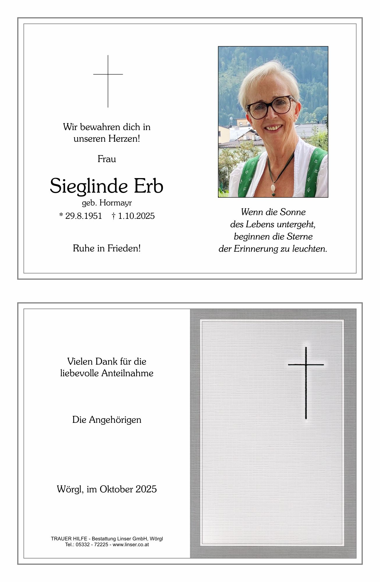Mit tiefer Trauer im Herzen haben wir die Todesnachricht eurer lieben Sieglinde vernommen. Viel zu schnell kam für euch alle der endgültige Abschied von eurer lieben Gattin, Mutter und Oma. Die plötzliche Krankheit hat viel Leid und Schmerz in eurer Familie verursacht. Dieses Schicksal anzunehmen, fällt niemandem leicht. Wenn eine treu sorgende Mutter, eine liebevolle Oma und eine langjährige, geliebte Ehegattin, für immer die Familie verlassen muss, so hinterlässt sie eine große Lücke, die nie mehr zu schließen sein wird. Und doch, vielleicht wurde ihr ein langes, noch schwerer zu ertragendes Leiden erspart. Der Herrgott im Himmel hat wieder einen Engel gebraucht. Wir denken gerne an die nette, herzliche, lebensfrohe Frau Sieglinde und werden ihr stets ein ehrendes Andenken bewahren. Gerade in den letzten Jahren durften wir im Kreise des Seniorenbundes Wörgl viele schöne Stunden, fröhliche, gesellige Ereignisse und Reisen, gemeinsam erleben. Sie wird daher in Gedanken und Gesprächen immer in unserer Mitte sein. Wir wünschen dir, lieber Pepi und der ganzen Trauerfamilie viel Kraft und Trost in dieser schweren Zeit.