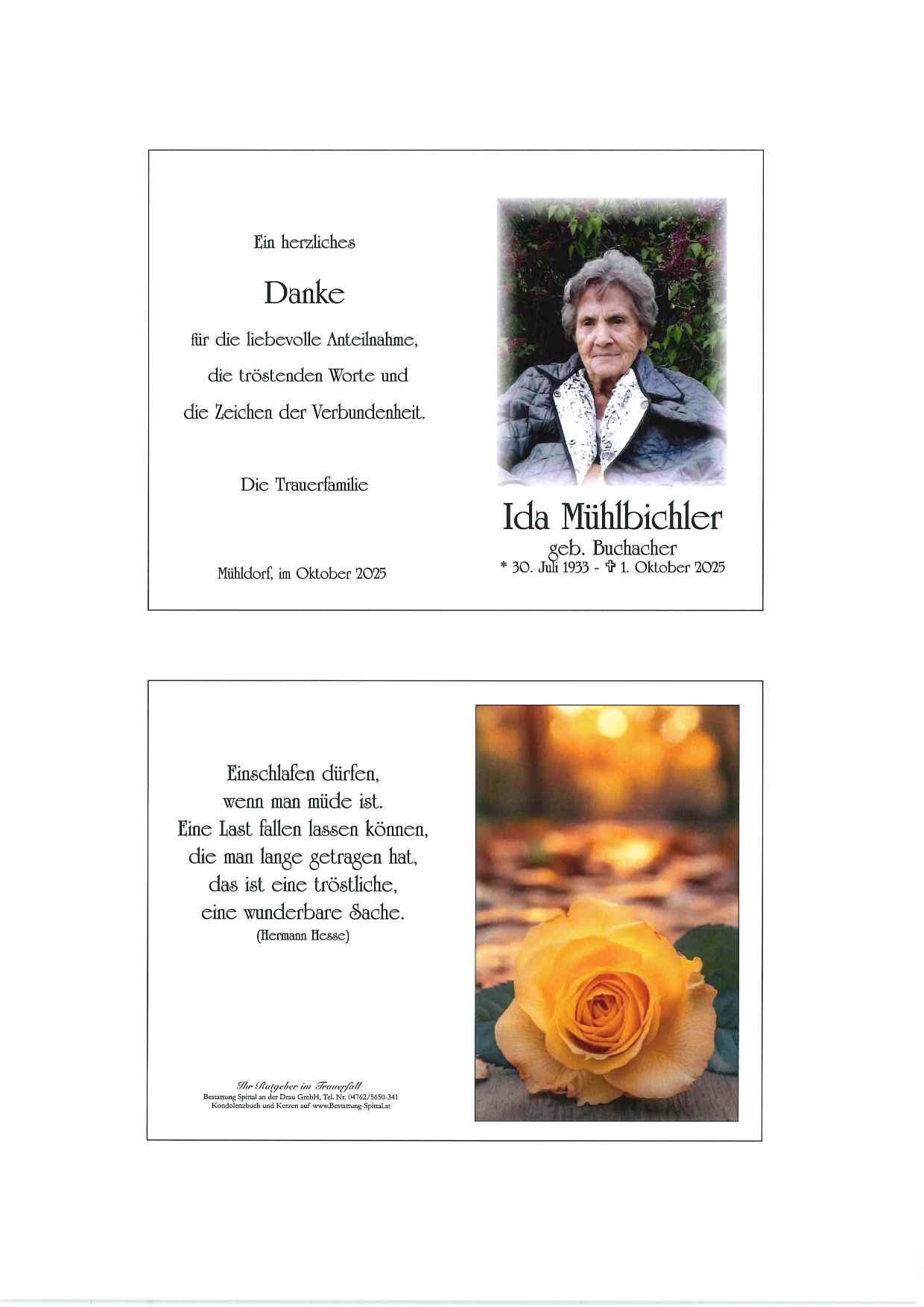 • Liebe Familie ich möchte euch auf diesem Wege, mein Mitgefühl übermitteln und dabei gleichzeitig mein tiefstes Beileid aussprechen. Es ist sehr schwer eine Mama, Oma, Uroma gehen zu lassen. Aber für Tante Ida war es wohl auch eine Erlösung! Leicht gesagt! Ich wünsche euch viel Kraft in der schwierigen Zeit um den Verlust eines so geliebten Menschen, auf zu arbeiten. Ich wünsche mir auch, ja ich bin sogar überzeugt davon, dass Tante Ida ihren geliebten Sepp wieder trifft. Tante Ida war für mich immer ein Vorbild und eine starke Persönlichkeit, Liebe Tante Ida, eine Gute, letzte Reise, mit verdientem "Ankommen" auf der andere Seite unseres Lebens. Möge der Herrgott dich aufnehmen und dir stets beistehen! Ruhe in Frieden! Oamoi sech ma ins wieda! Meine letzt'n Griass aus dem PassionsspielOrt!? Erl. Wea am Soamstag bei ins'ra letzt'n Vorstellung nu amoi goanz fest an di denk'n! PFIATI Tante Ida!! GLG vom Schorsch