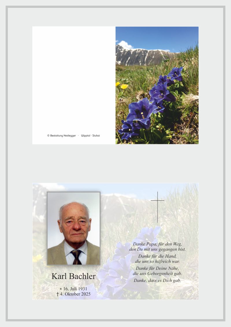 • Lieber Wolfgang, liebe Charlotte, liebe Trauerfamilie. Ich möchte euch allen mein herzliches Beileid aussprechen. Ich erinnere mich sehr gerne an euren Vater, meinen sehr geschätzten Arbeitskollegen. Er war wie ein väterlicher Kollege, hat mir einiges beigebracht und war sehr wertschätzend. Auch in seiner Gärtnerei haben wir oft gemeinsam gearbeitet. So verbrachten wir viele schöne Stunden. Ich werde Karl stets in liebevoller Erinnerung behalten. Liebe Grüße, Hermann.