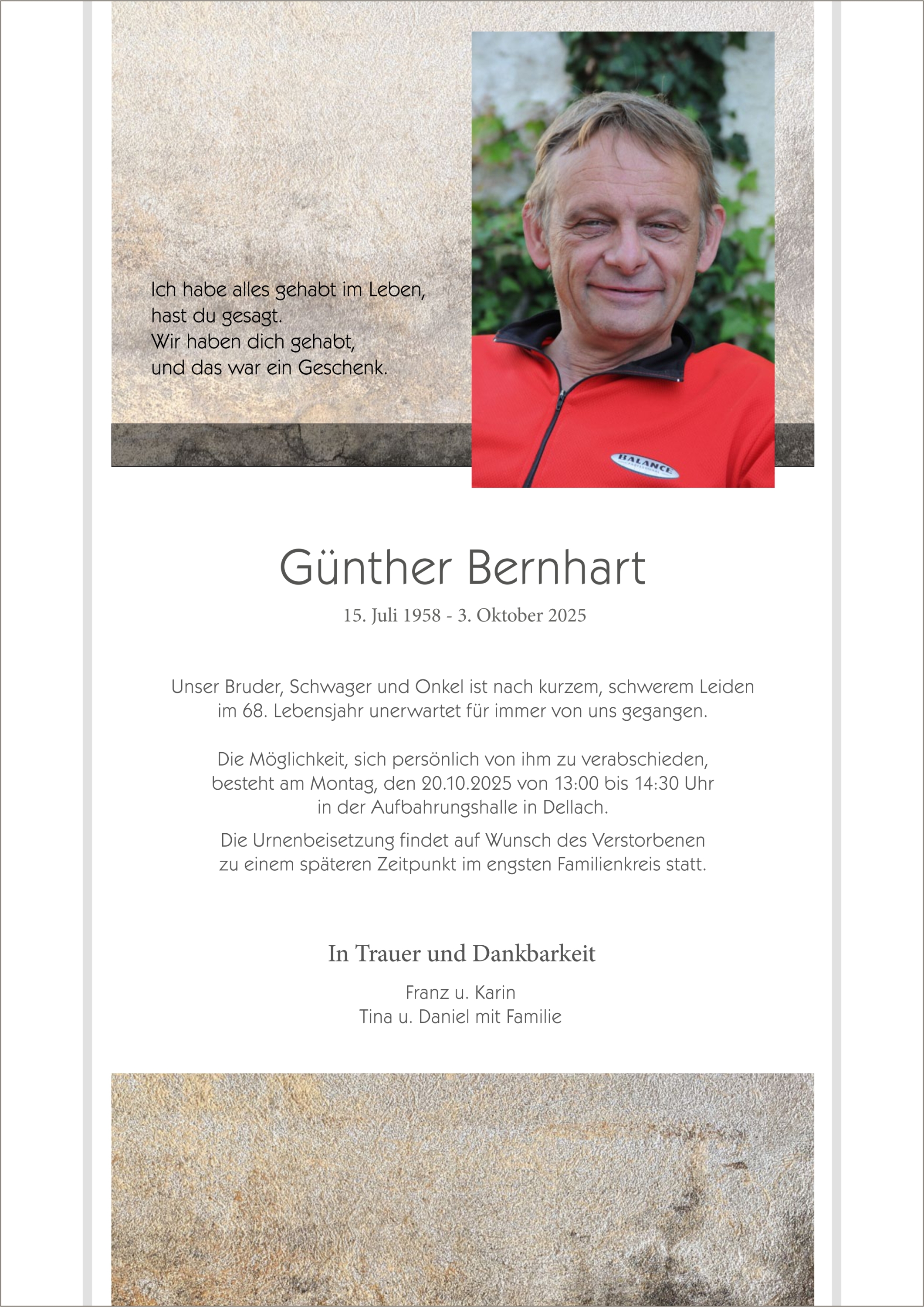 Bestattung wurde durchgeführt von: Markus Ertl Bestattung Weissensee Neusach 26 9762 - Weißensee Tel.: 04713 22 29 zum Bestatter