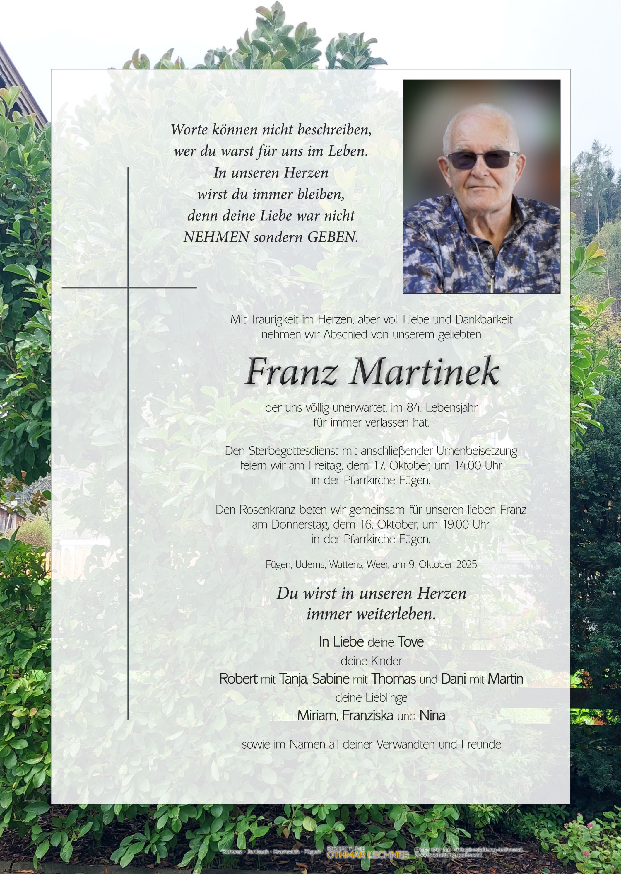 Bestattung wurde durchgeführt von: Manuel Ram Manuel Ram Bestattung Othmar Lechner Husslstraße 40 6130 - Schwaz Tel.: 050 1717 140 zum Bestatter