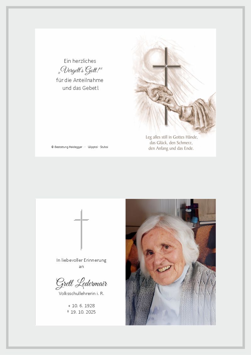 Bestattung wurde durchgeführt von: Karl Neurauter Karl Neurauter Bestattung Heidegger Brennerstraße 69 6150 - Steinach am Brenner Tel.: 05275 5211 zum Bestatter