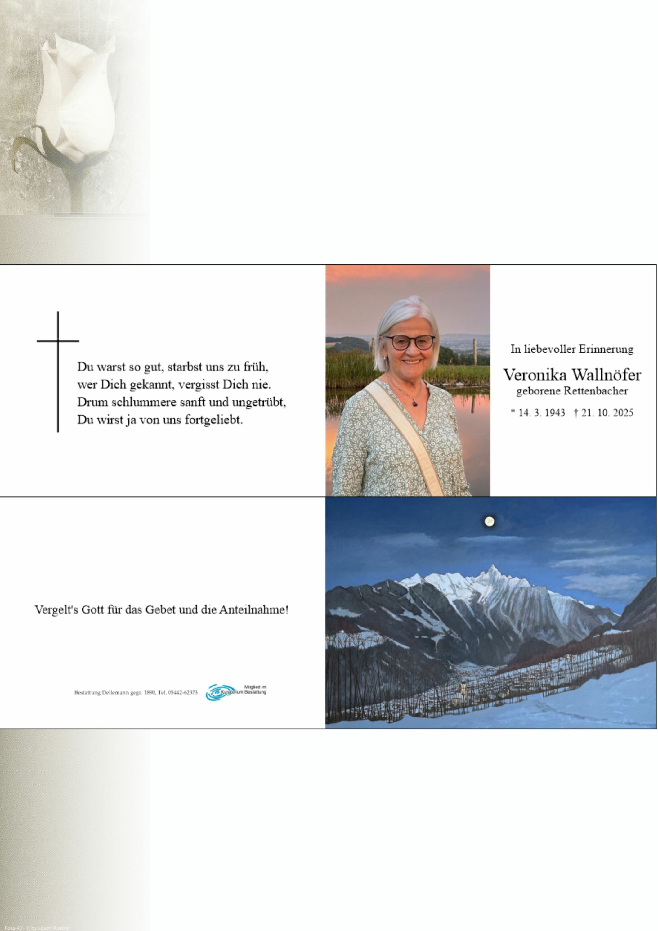 Wir haben diese Nachricht mit Schmerzen gelesen. Haben Frau Veroika in gutem gesunden Aussehen in Erinnerung. Was hat so schnell zum Tod geführt?!? Vielleicht kann ich das mal erfahren. Ich--wir--wünschen Ihnen allen viel Kraft in dieser schweren verlusttragenden Tagen und Wochen. Dr. Richard Schönherr mit Gattin Christl aus Zams und allen Mitgliedern unserer Familien!