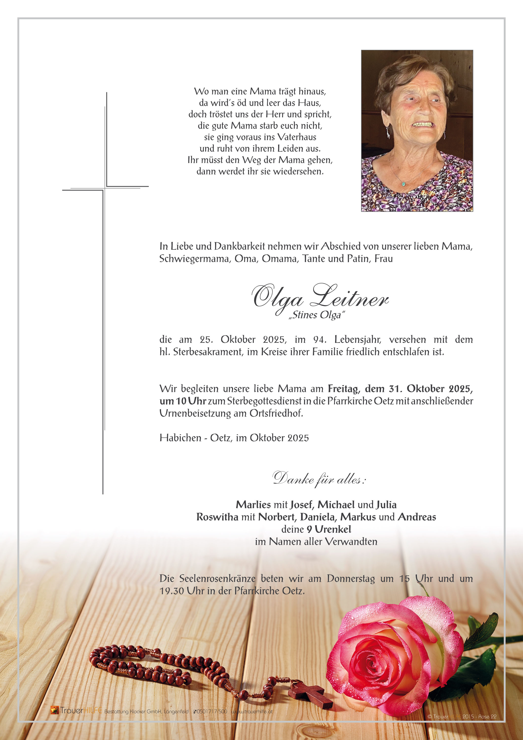 Marlies, durch deine unermüdliche Betreuung und Fürsorge hast du den Wunsch von Olga erfüllt, in Ruhe, im Kreise ihrer Familie zu Hause sterben zu können.