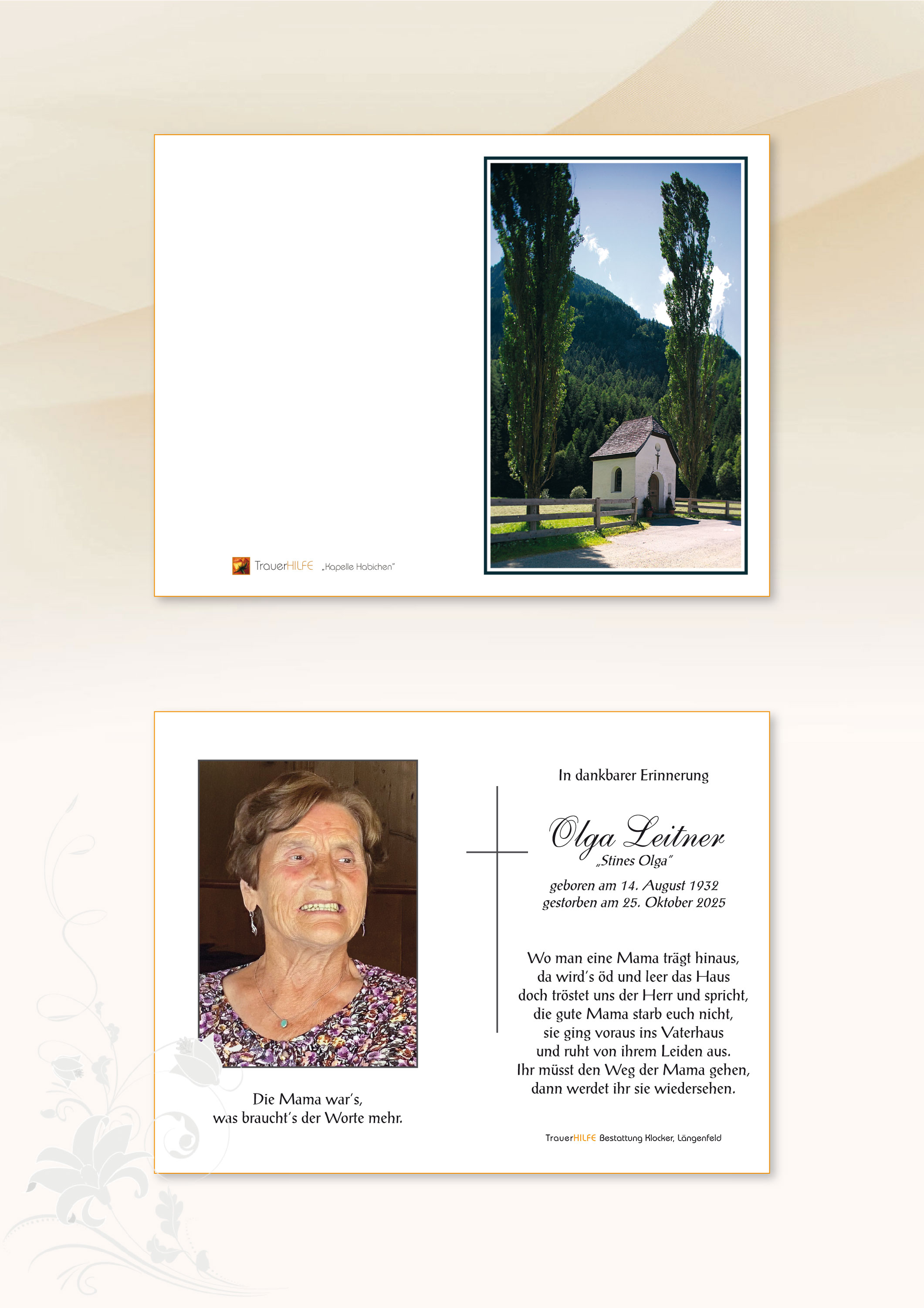 Wir wünschen euch, in der Zeit der Trauer und des Abschiednehmens, viele liebevolle Erinnerungen und schöne Gedanken an eure liebe Olga.