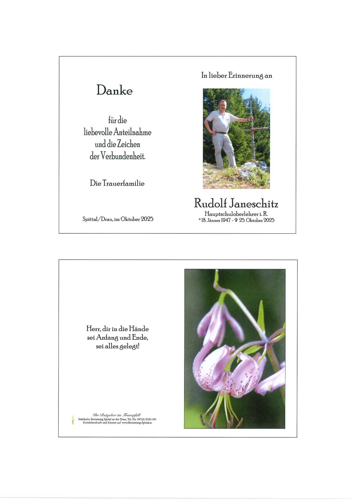 Bestattung wurde durchgeführt von: Gerald Baumgartner/Franz Kramaritsch/Sylvia Wippl Gerald Baumgartner/Franz Kramaritsch/Sylvia Wippl Städtische Bestattungsanstalt Spittal an der Drau Edlinger Straße 55 9800 - Spittal an der Drau Tel.: 04762 5650341 zum Bestatter
