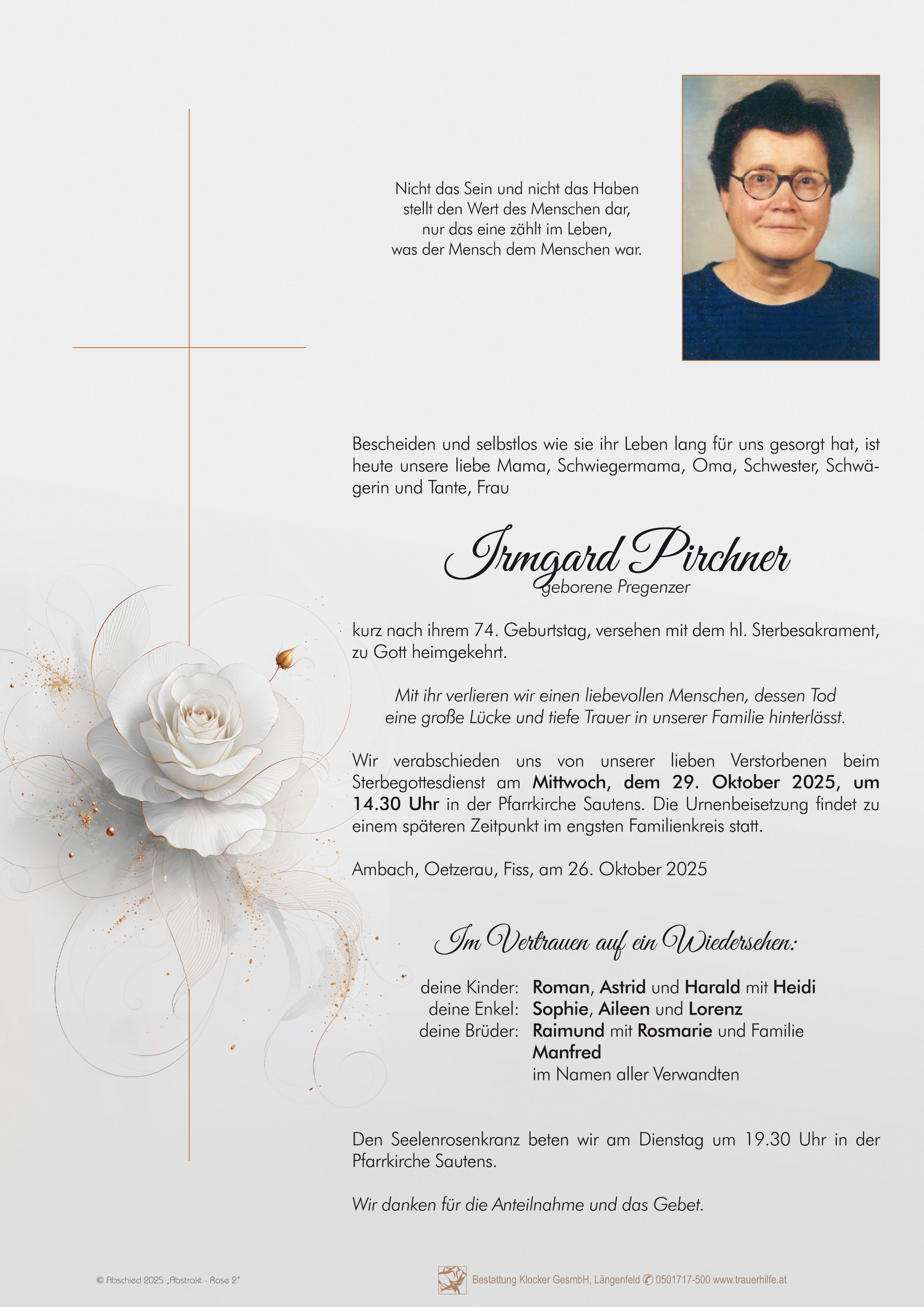 Auf diesem Wege möchten wir unser aufrichtiges Beileid ausdrücken. Wir werden Irmgard immer in guter Erinnerung behalten und wir bedanken uns, dass wir sie auf einem kleinen Stück ihres Weges begleiten durften.