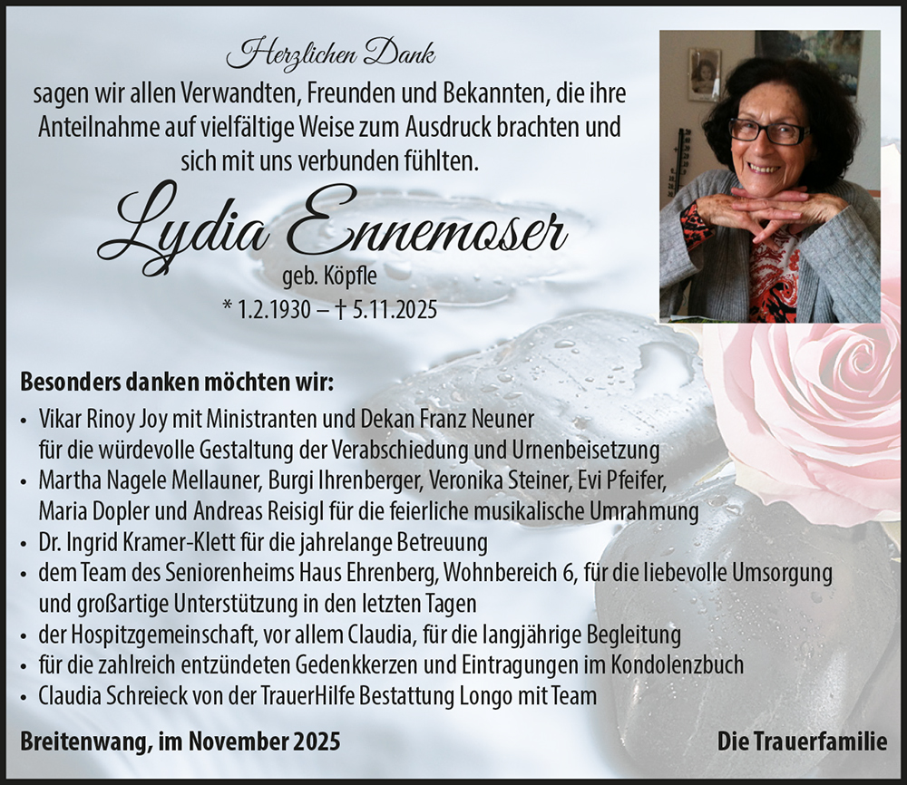 In tiefer Trauer, aber trotzdem voller Dankbarkeit für alles Gute und Schöne, das wir gemeinsam mit Lydia erleben durften, sind wir verbunden mit ihr über den Tod hinaus! Unsere Hoffnung ist ein Wiedersehen in der Auferstehung!