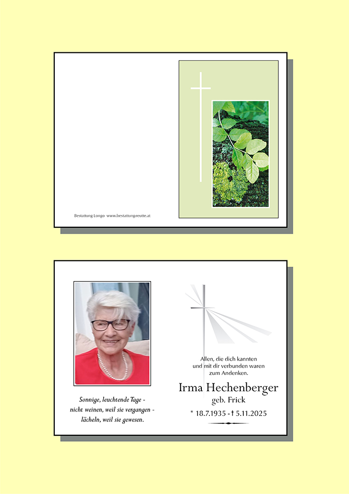 • Irma gehörte mit Flora Stoscheck und Toni Zumbrunnen zu unseren ersten treuen Stammkundinnen als wir vor 50ig Jahren die Firma Müller&Schennach gegründet haben. Vieles das damals in Reutte neu war, z.B. Hausfrauenausflüge, Faschingsfeiern am Unsinnigen, Nikolaus Besuch im Geschäft, hat uns viel mehr als "nur" Kaufmann und Kundinnen, sondern Freunde werden lassen.