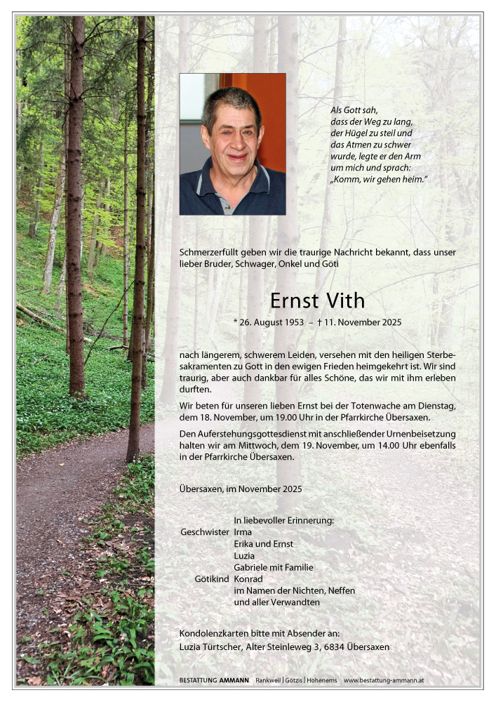 Bestattung wurde durchgeführt von: Bestattung Ammann Rankweil Ammann Bestattung GmbH Rankweil Splügenweg 1 6830 - Rankweil Tel.: 05522 42104 zum Bestatter