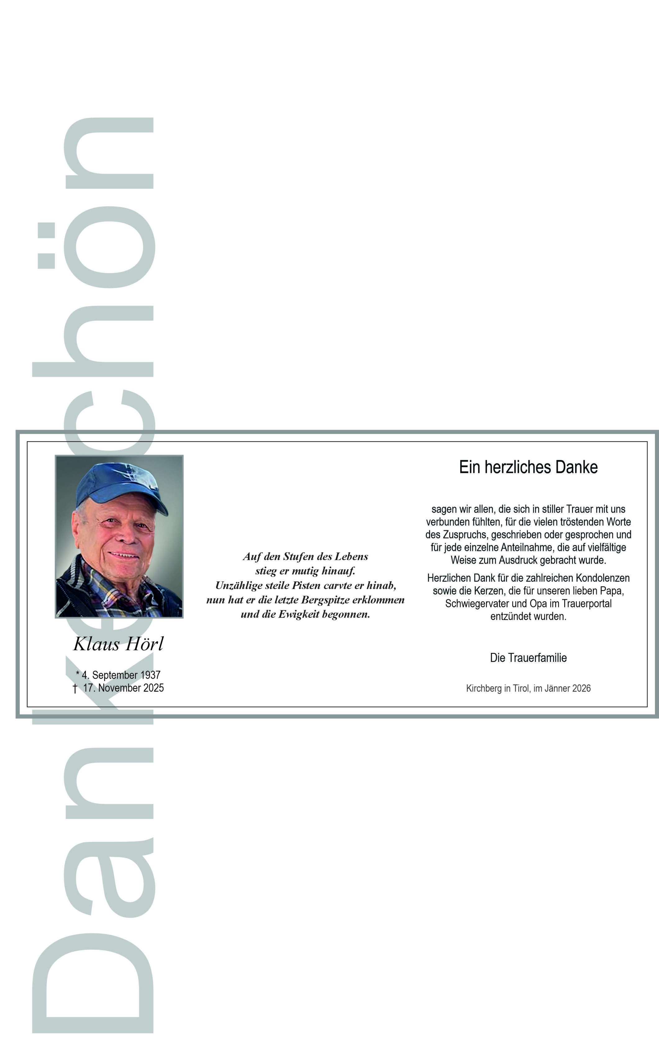• Lieber Gerhardt, Liebe Gitti und Familie, ich kannte Klaus von klein auf, habe ihn sehr geschätzt. Er hat uns viel geholfen bei unseren Bauten. Er war in der Skischule ein schwätzenswerter Kollege und ich habe ihn immer wieder irgendwo getroffen und wir haben viel über "Früher" diskutiert und gelacht. Umso trauriger ist es, dass wir uns hier nicht mehr wiedersehen. Euch wünsche ich viel Kraft, Klaus Dir eine gute Reise,.....
