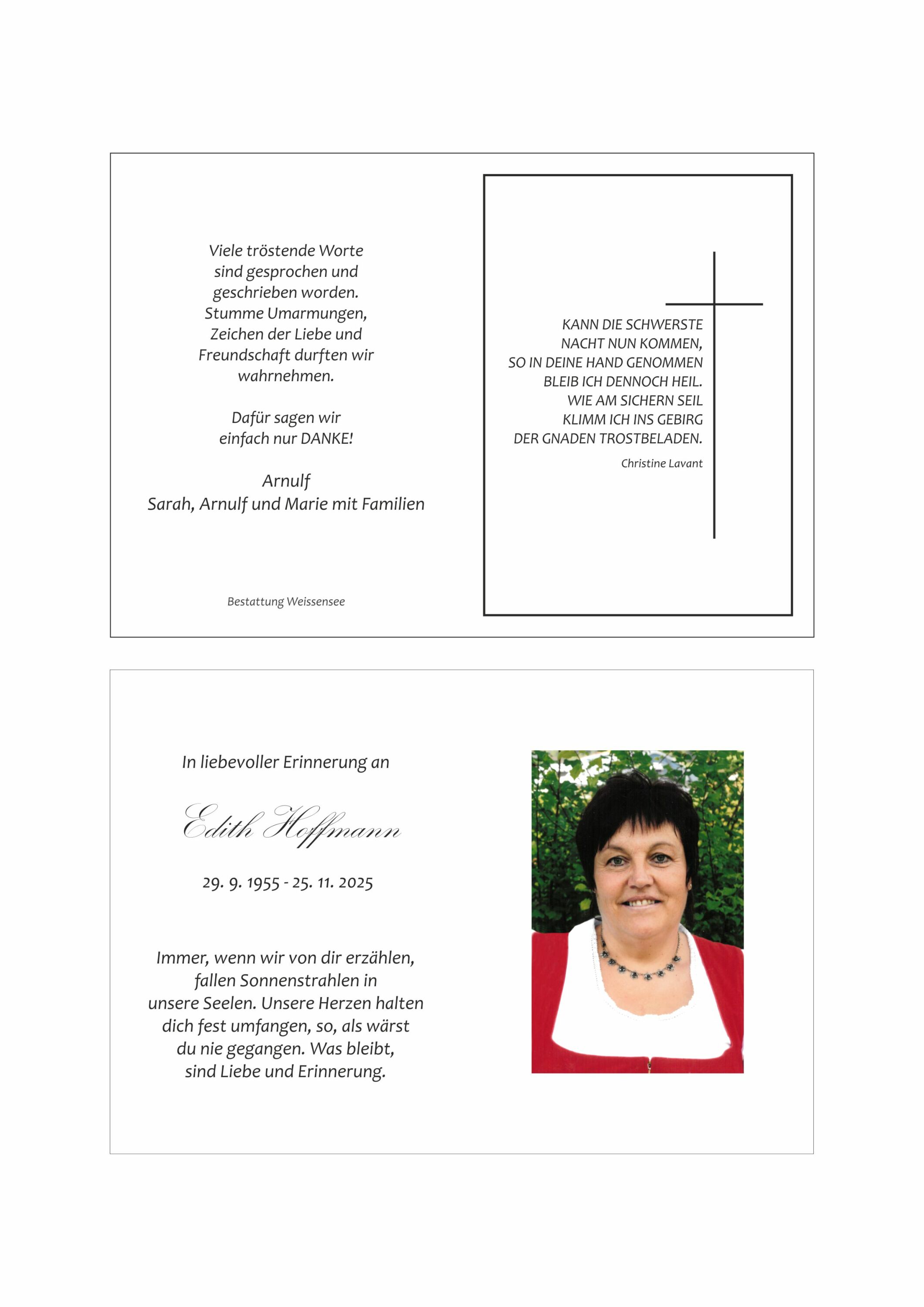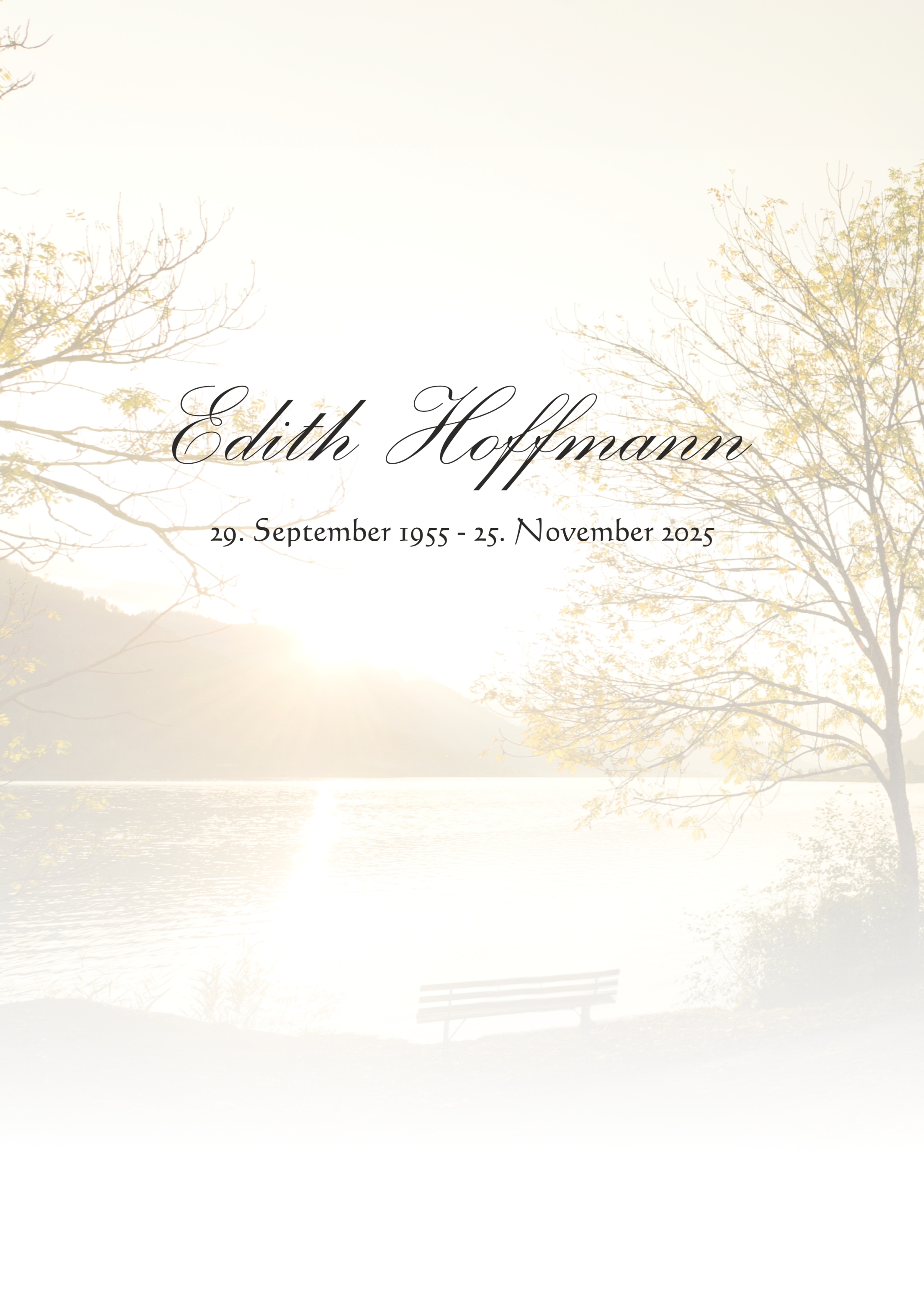 Aufrichtige Anteilnahme zum Heimgang eurer Mama Edith, die immer für alle da war und für jeden ein offenes frohes Herz hatte mit viel Verständnis und Fürsorge.