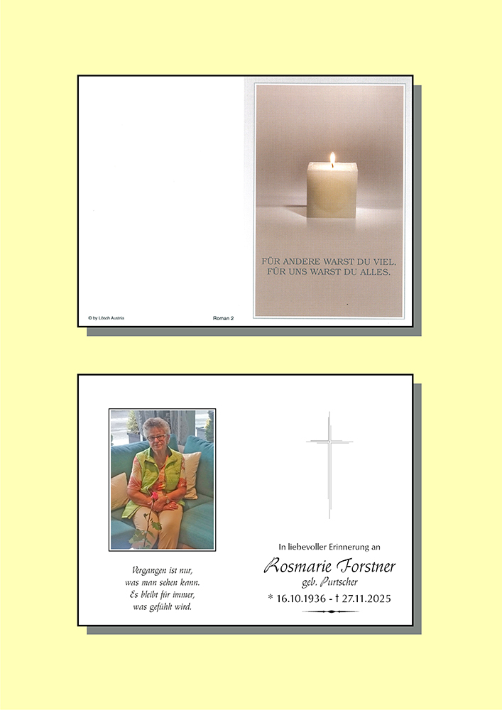 Liebe Frau Forstner nun haben Sie Ihre letzte Ruhe gefunden und sind mit Ihren Liebest wieder vereint.