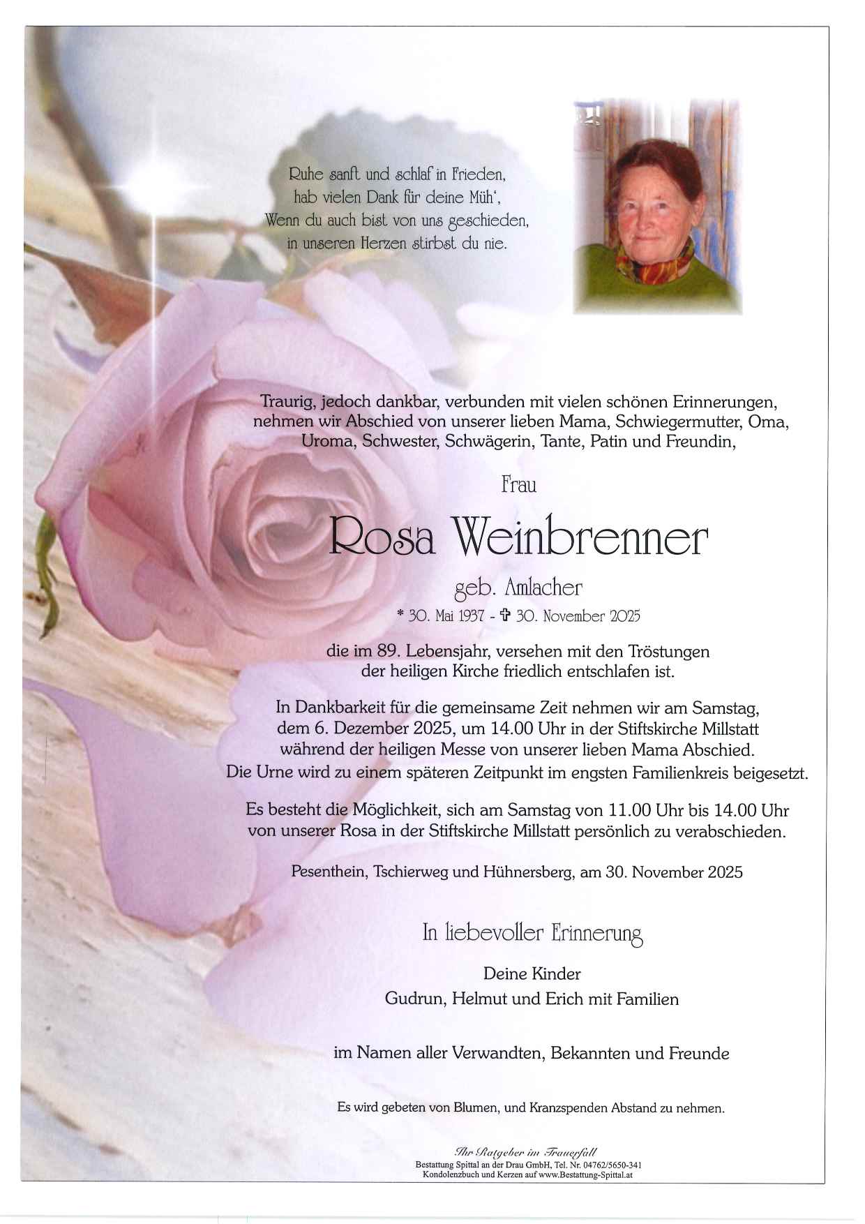 Bestattung wurde durchgeführt von: Gerald Baumgartner/Franz Kramaritsch/Sylvia Wippl Gerald Baumgartner/Franz Kramaritsch/Sylvia Wippl Städtische Bestattungsanstalt Spittal an der Drau Edlinger Straße 55 9800 - Spittal an der Drau Tel.: 04762 5650341 zum Bestatter
