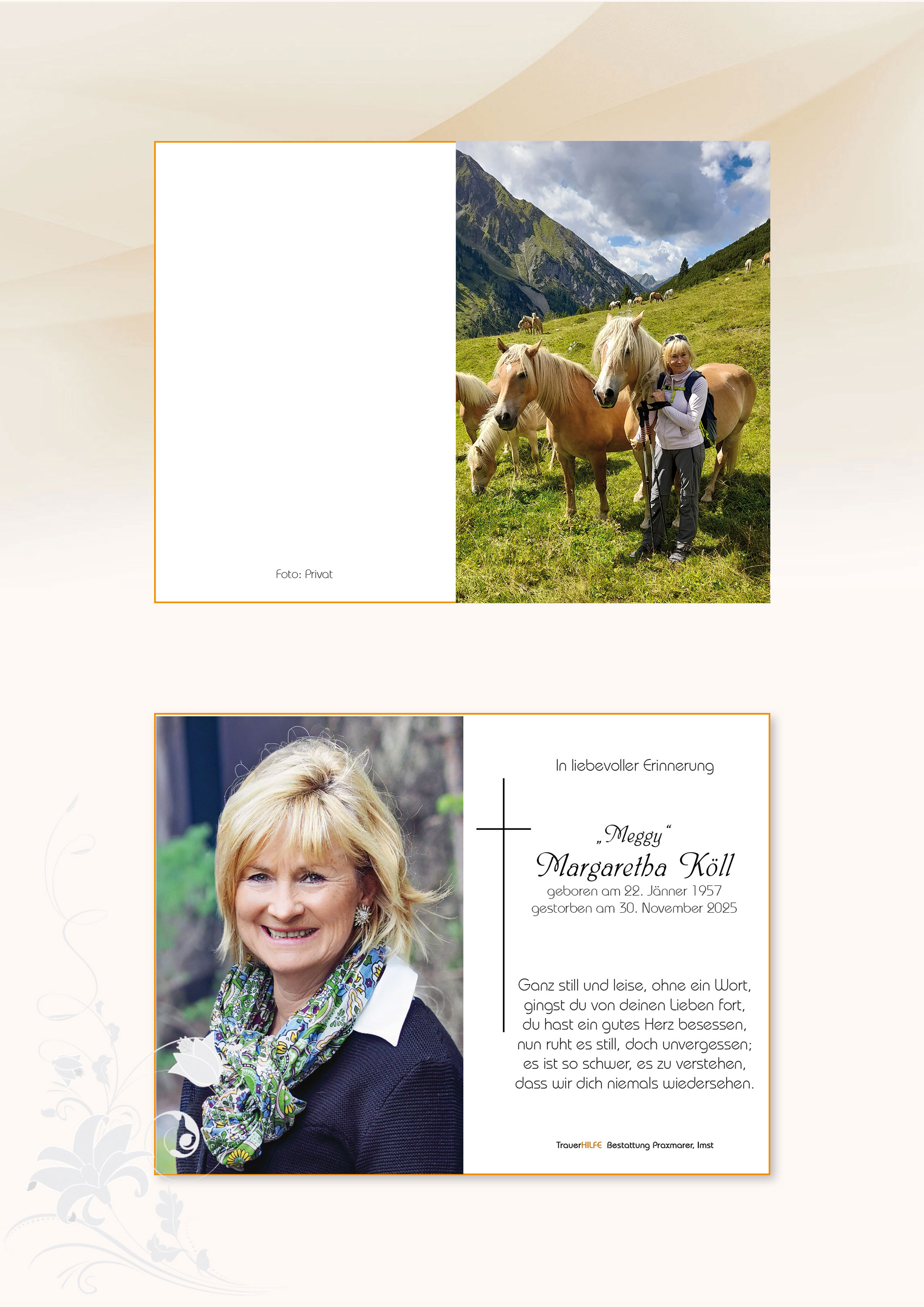 Meggy war ein besonderer Mensch, und die Liebe, die sie euch geschenkt hat, bleibt. Sie lebt weiter in euren Erinnerungen, in euren Worten, in allem, was sie in euch hinterlassen hat. Möge dieser Gedanke euch tragen, wenn die Tage schwer sind und alles fragil wirkt.