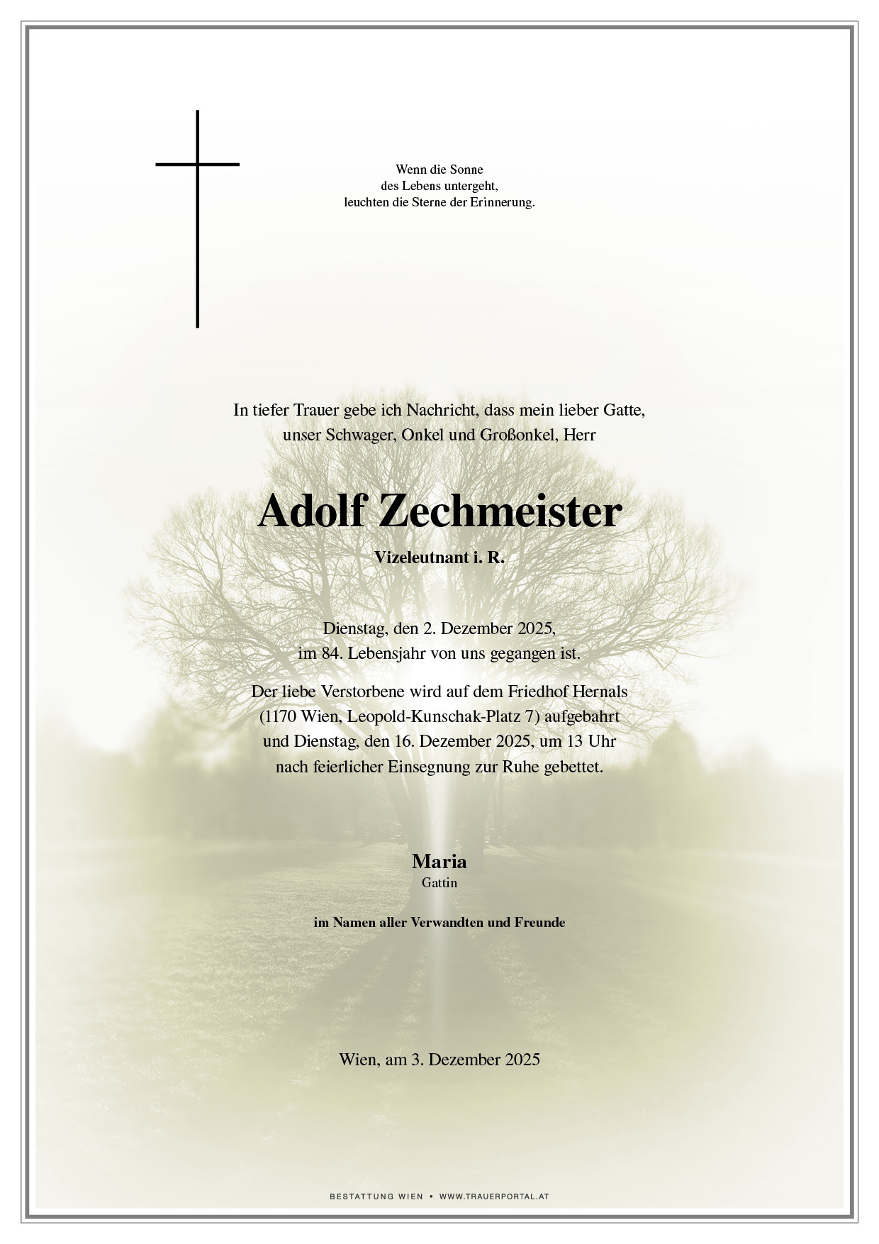 Bestattung wurde durchgeführt von: Bestattung Wien Bestattung Wien GmbH Simmeringer Hauptstraße 339 1110 - Wien (Simmering) Tel.: 01 501950 zum Bestatter