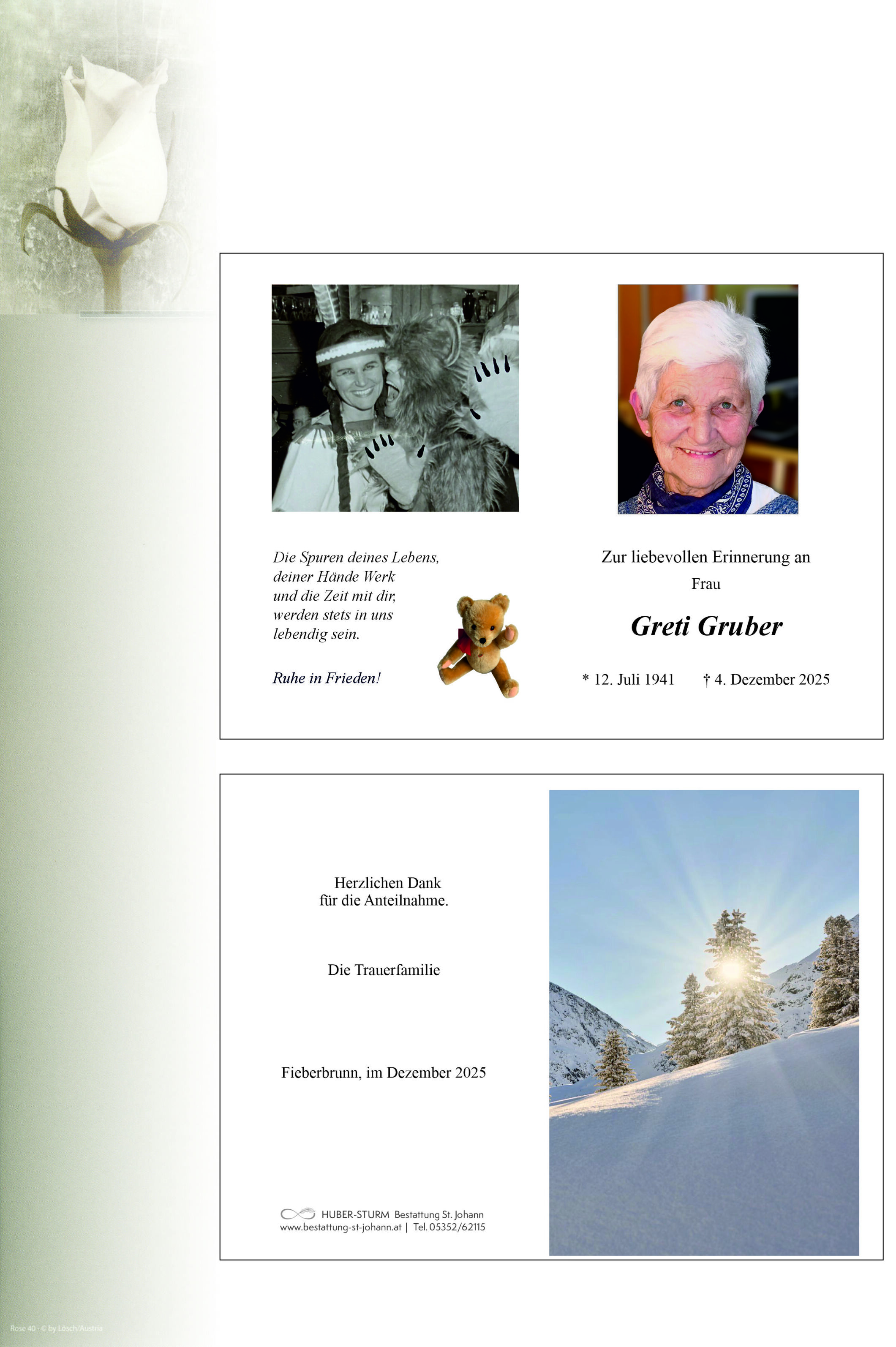 Aufrichtige Anteilnahme entbieten die Fieberbrunner Pensionisten:Innen, wir werden unserem langjährigen Mitglied Greti stets ein ehrendes Andenken bewahren! Sie möge ruhen in Frieden!