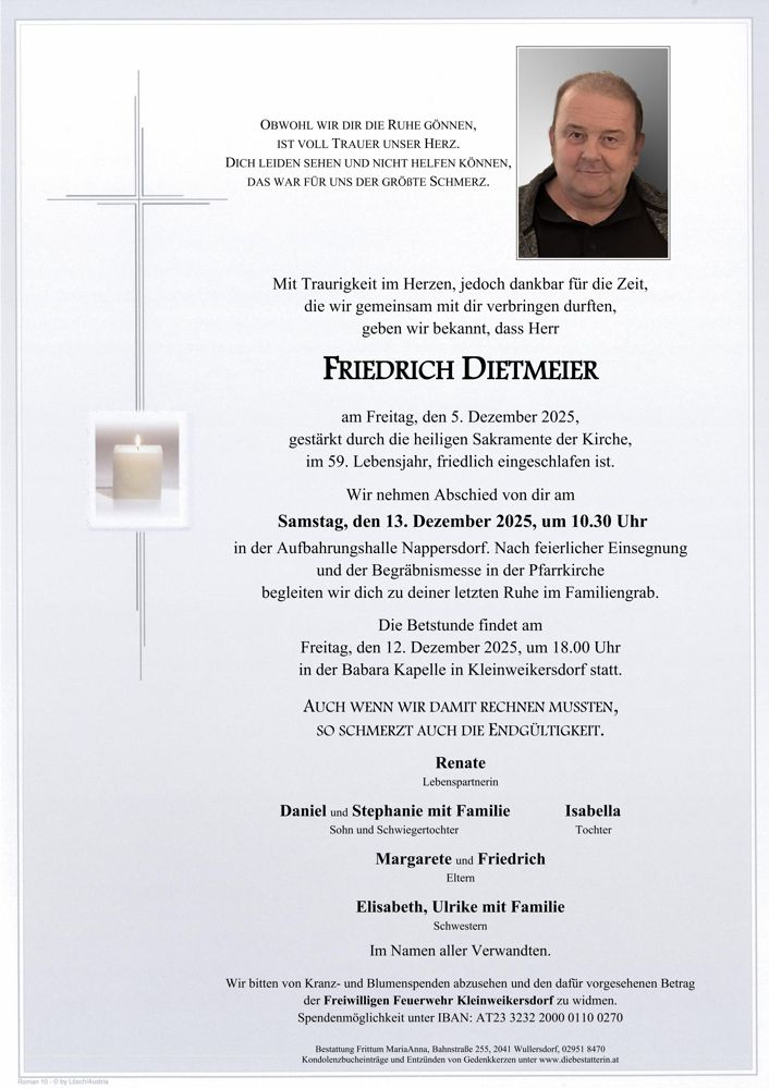 Neue Kerze für Friedrich Dietmeier entzünden.