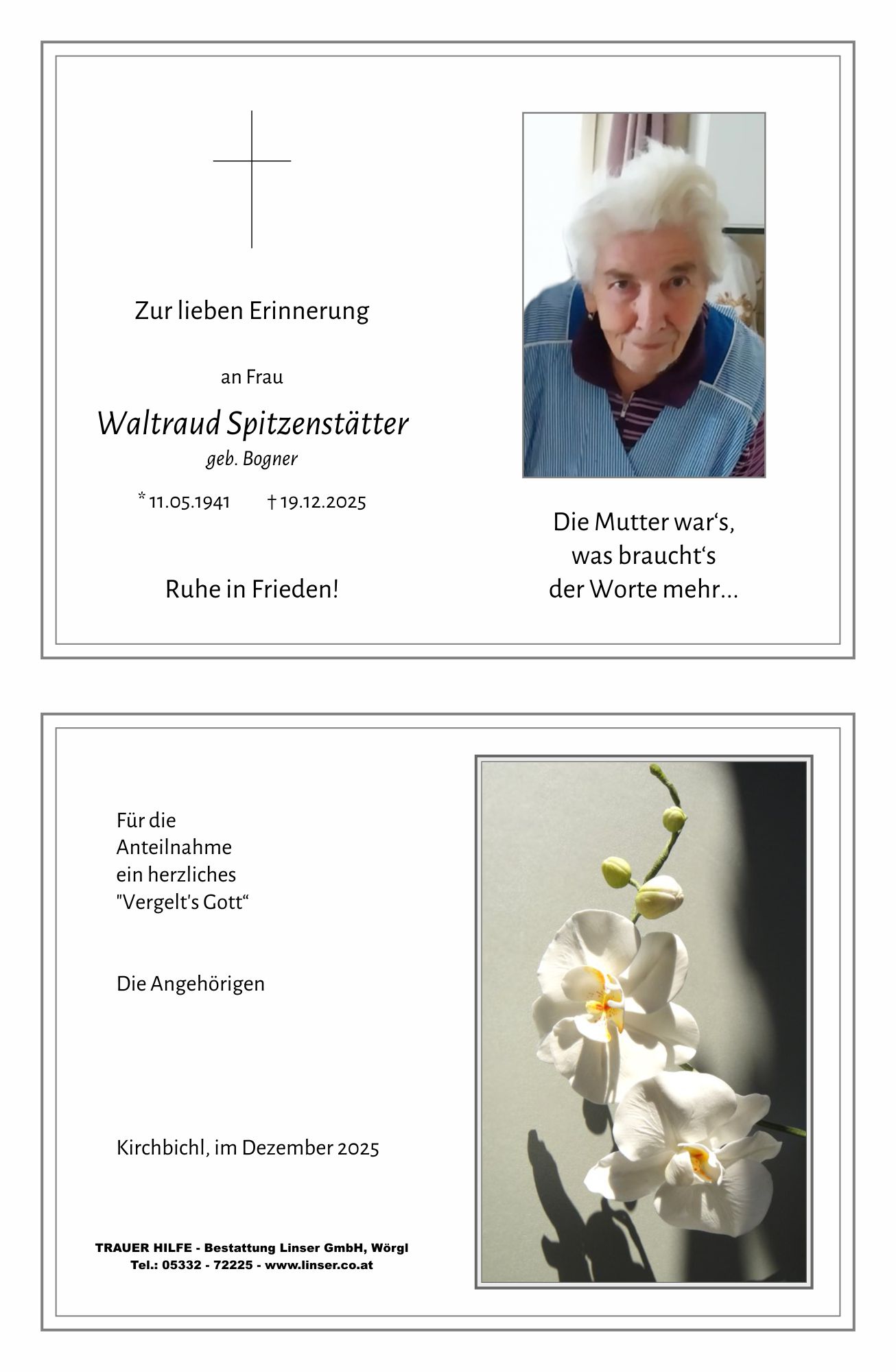 Bestattung wurde durchgeführt von: Walter Linser TrauerHilfe Bestattung Linser GmbH Wildschönauerstraße 41 6300 - Wörgl Tel.: 05332 72225 zum Bestatter
