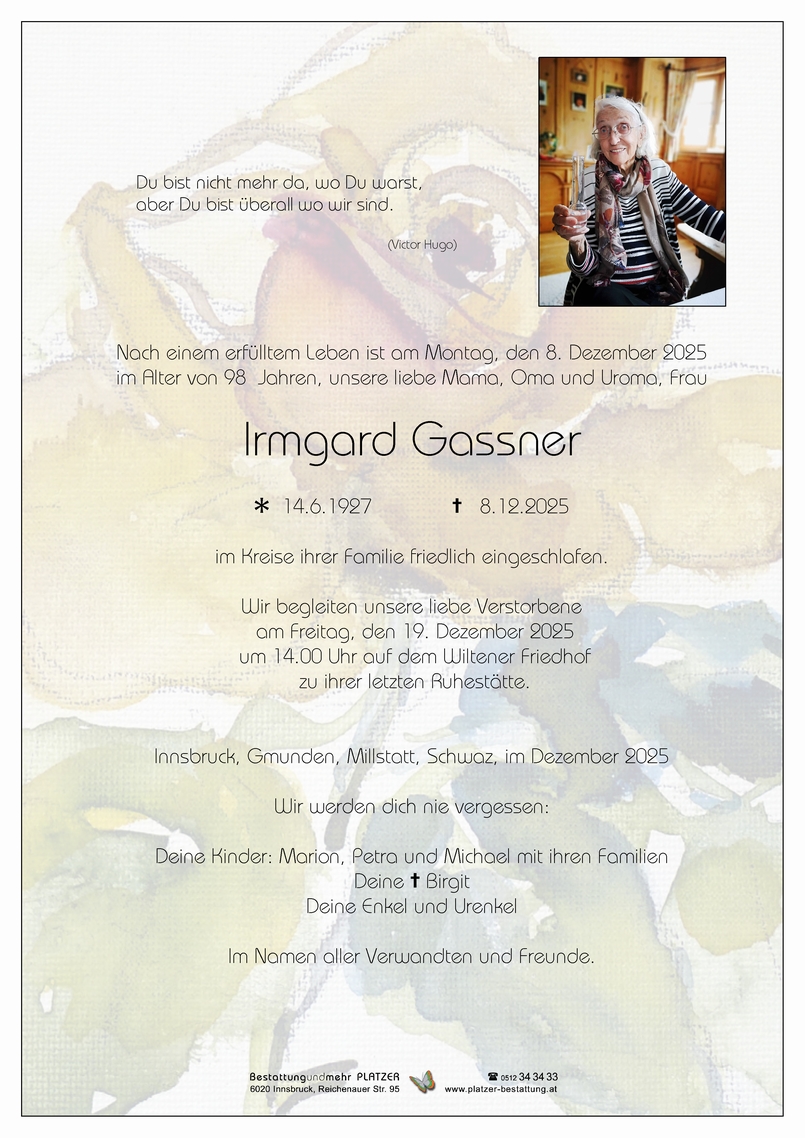 Bestattung wurde durchgeführt von: Mag. Martin Müller Concordia Bestattung 6020 - Innsbruck Reichenauer Str. 95 6060 - Hall i. T. Salzburger Str. 33 Tel.: 0512 34 34 33 Tel.: 05223 57 2 54 zum Bestatter