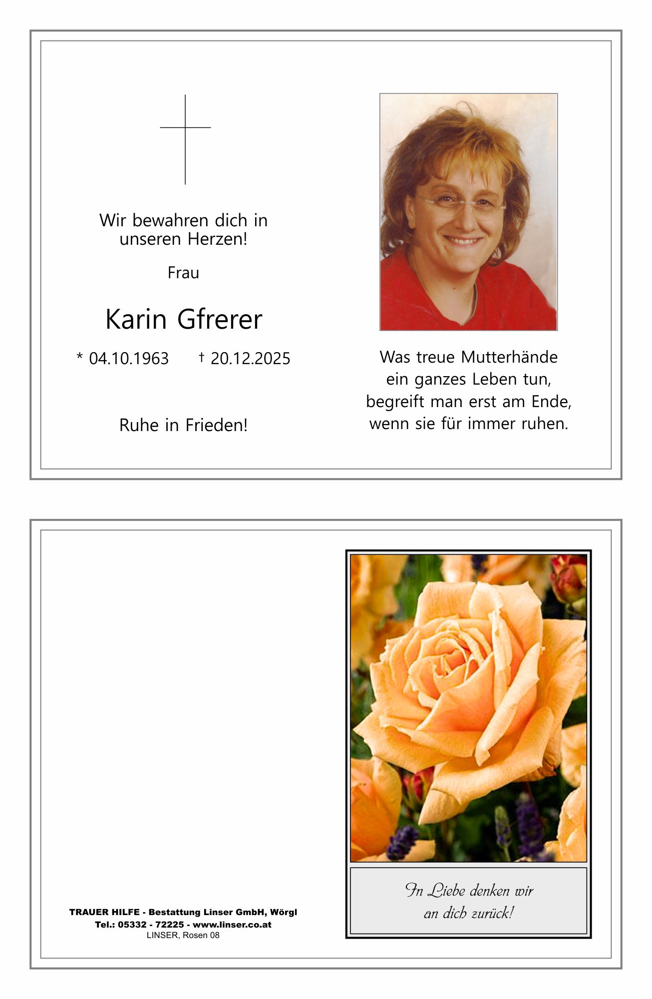 Bestattung wurde durchgeführt von: Walter Linser TrauerHilfe Bestattung Linser GmbH Wildschönauerstraße 41 6300 - Wörgl Tel.: 05332 72225 zum Bestatter