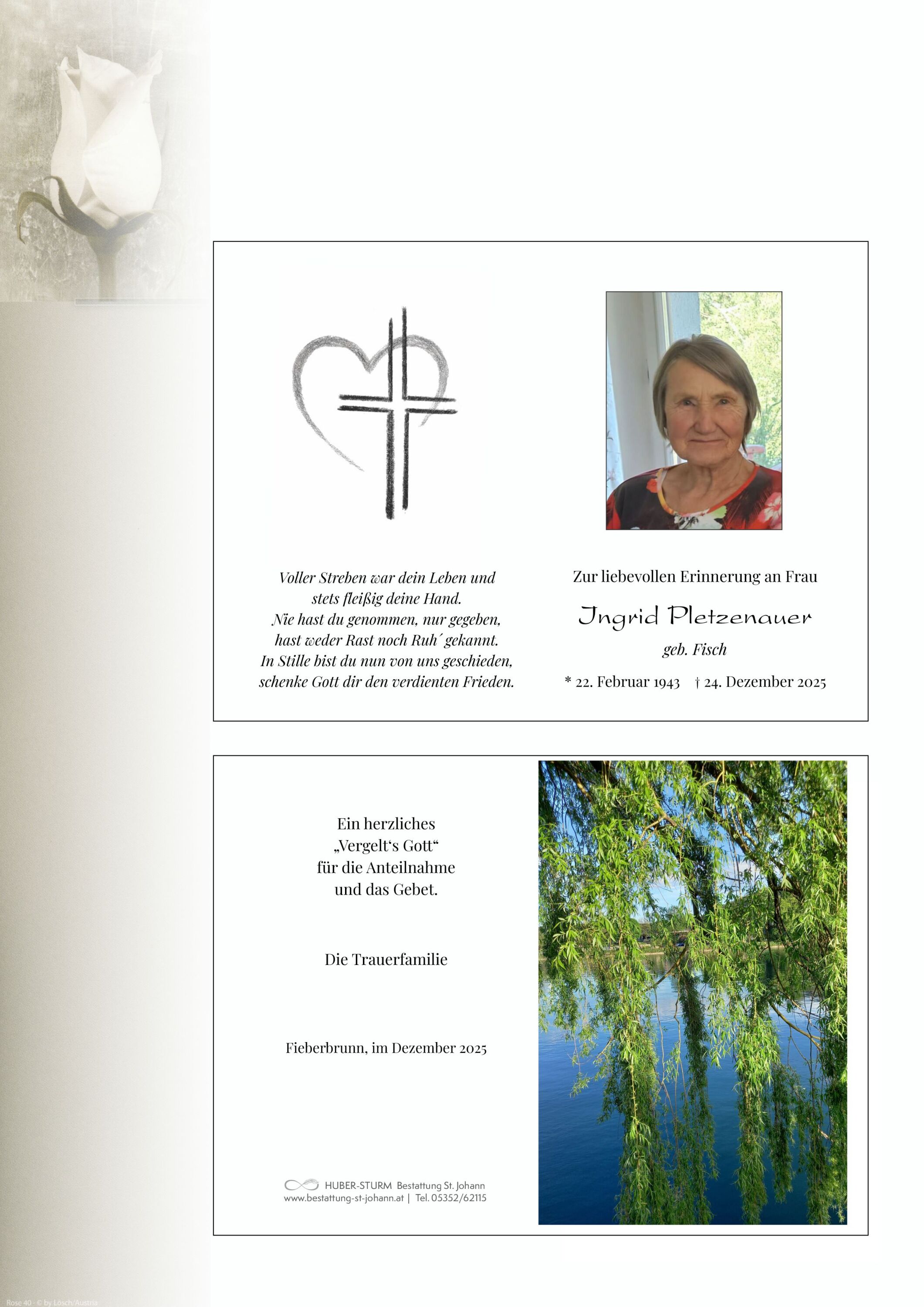 • Aufrichtige Anteilnahme entbieten die Mitglieder des Fieberbrunner Pensionistenverbandes! Wir werden unser langjähriges, treues Mitglied Ingrid stets in guter Erinnerung behalten und ihr ein ehrendes Andenken bewahren! Sie möge ruhen in Frieden!