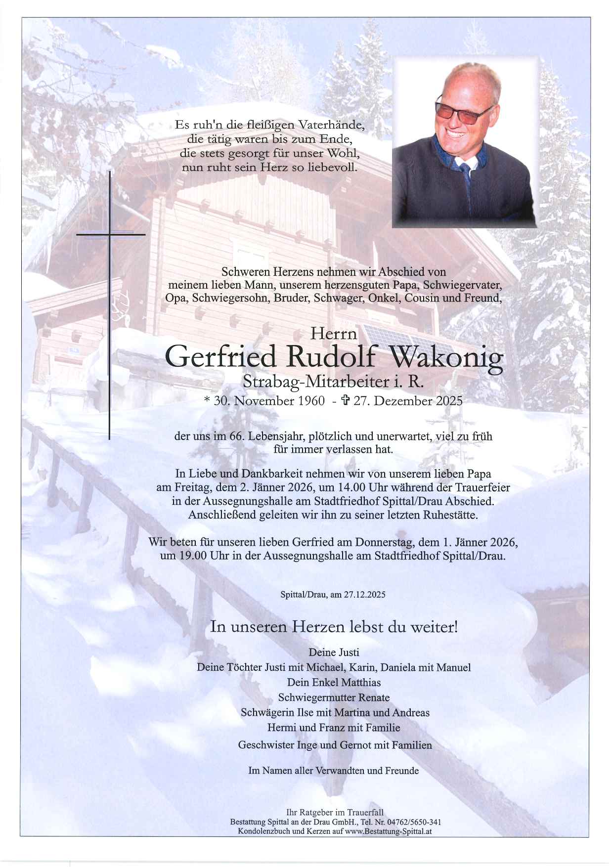 Doch Gott bestimmt die Zeit und rief deinen geliebten Gerfried, euren geliebten Vater in die Ewigkeit!