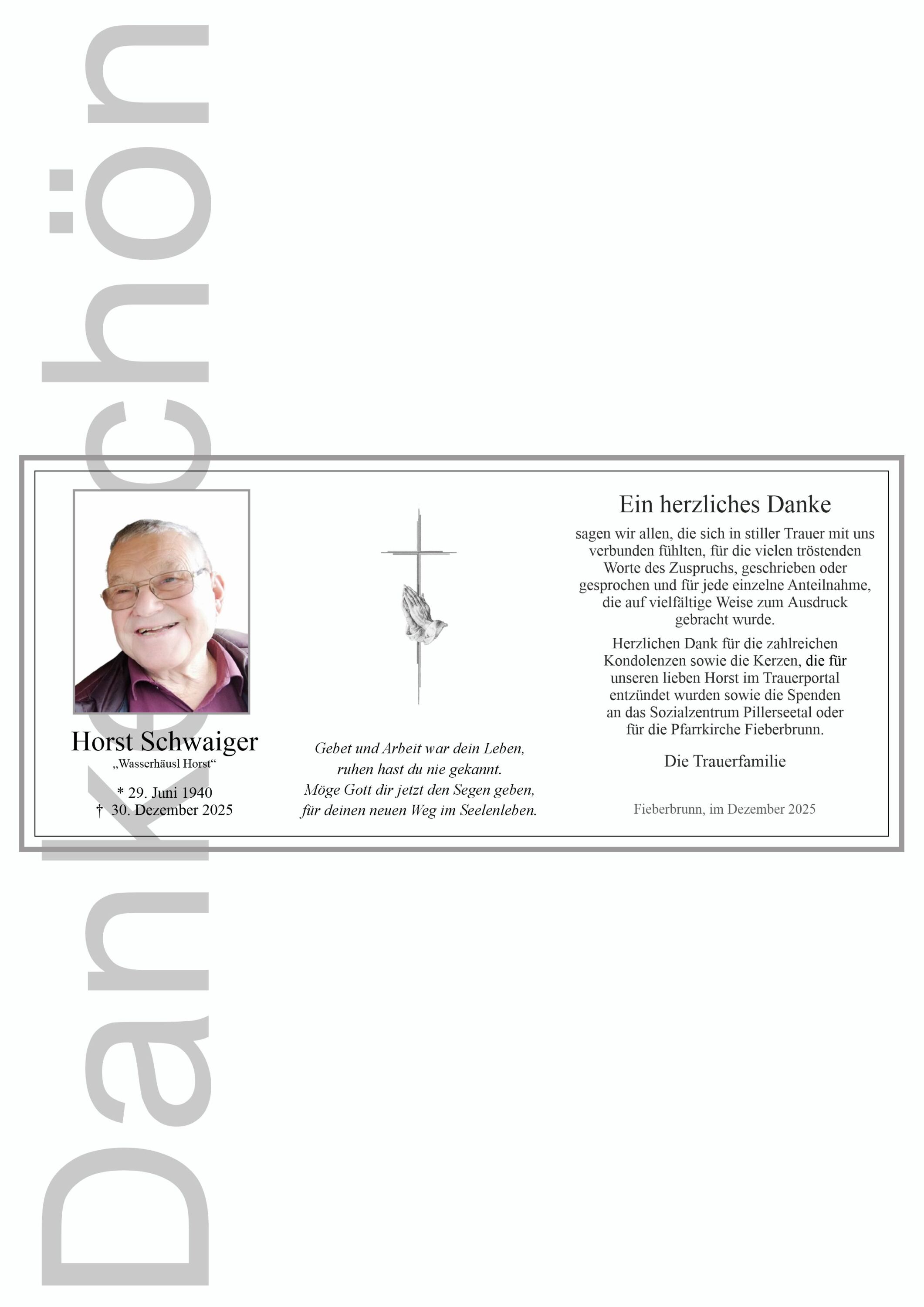 Mit großer Betroffenheit habe ich von deinem Abschied erfahren. Es schmerzt mich sehr einen alten Freund zu verlieren, mit dem mich viele wertvolle Erinnerungen verbinden. Bei euch in Fieberbrunn habe ich das Skifahren gelernt und die Tiroler Abende in der Alten Post mit Siggi an der Zitter und du mit Kopfstand auf der Tanzfläche, bleiben mir unvergessen.