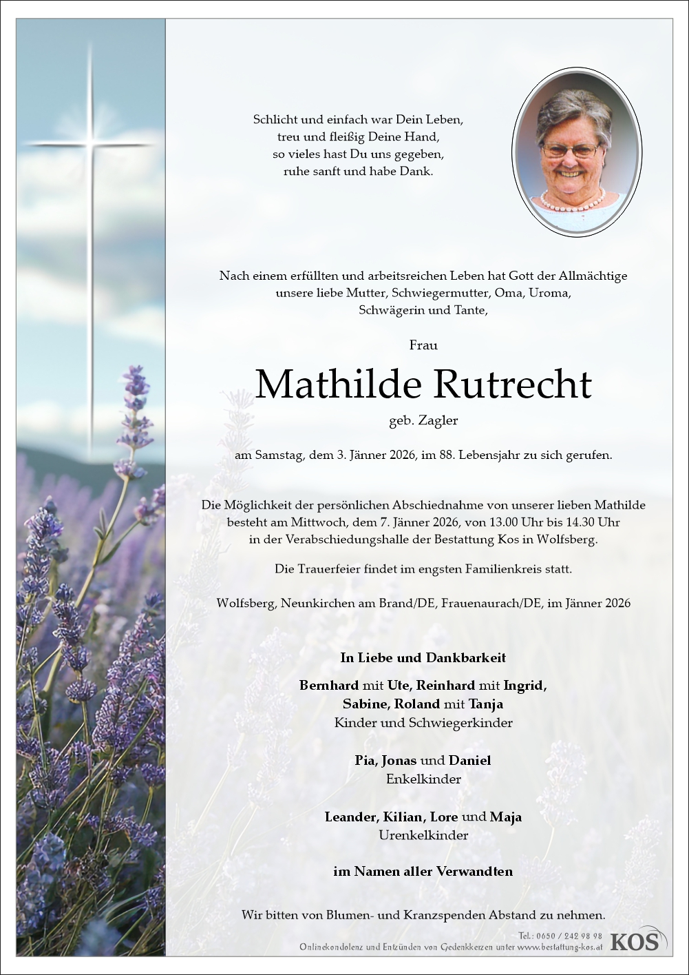 Bestattung wurde durchgeführt von: Familienbetrieb Bestattung Kos Bestattung A. & J. Kos GmbH Krankenhausstraße 2A 9400 - Wolfsberg Tel.: 0650 242 98 98 zum Bestatter