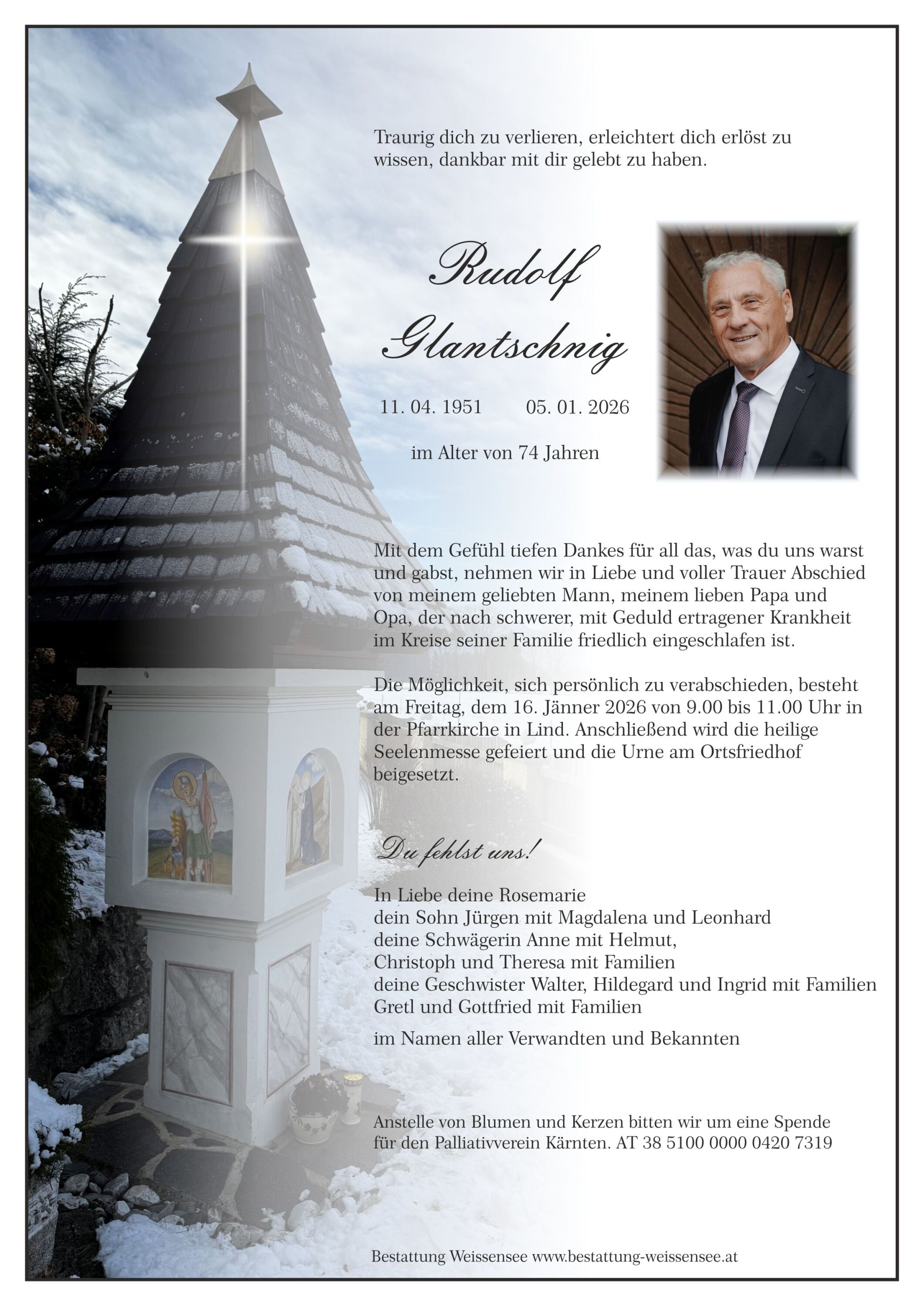 Neue Kerze für Rudolf Glantschnig entzünden.