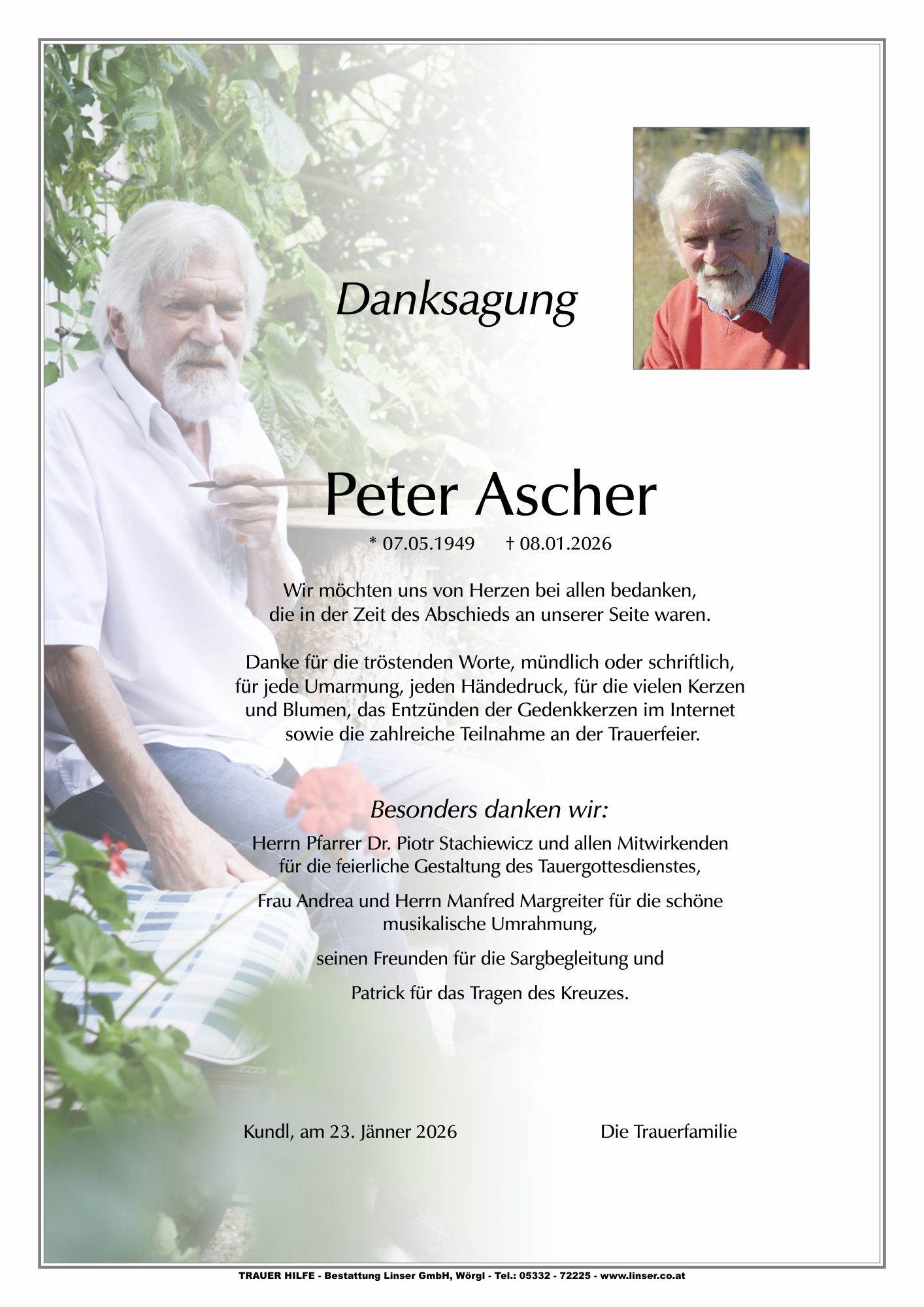 Liebe Sandra, liebe Trauerfamilie, mein aufrichtiges Beileid zum Tod deines Papas! Seit kleinauf weiß ich deinen Papa immer irgendwo rund um euer Haus herum. Immer hat er freundlich gegrüßt, manchmal leiser, manchmal lauter, und war ein echter vertrauter Fixpunkt meines fast täglichen Weges. Er fehlt mir schon jetzt beim Vorbeigehen, ich behalte ihn in lieber Erinnerung!